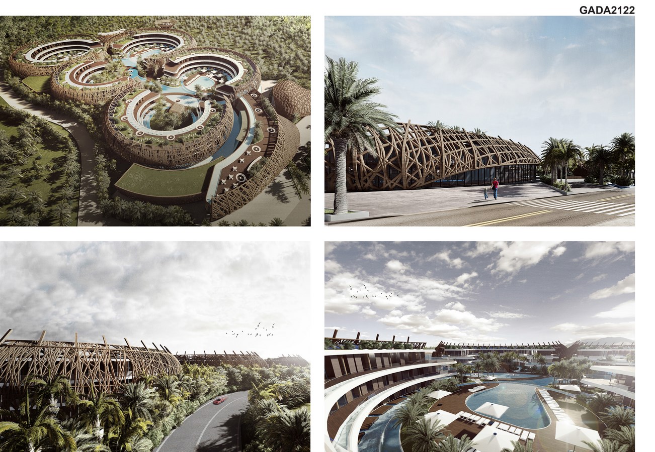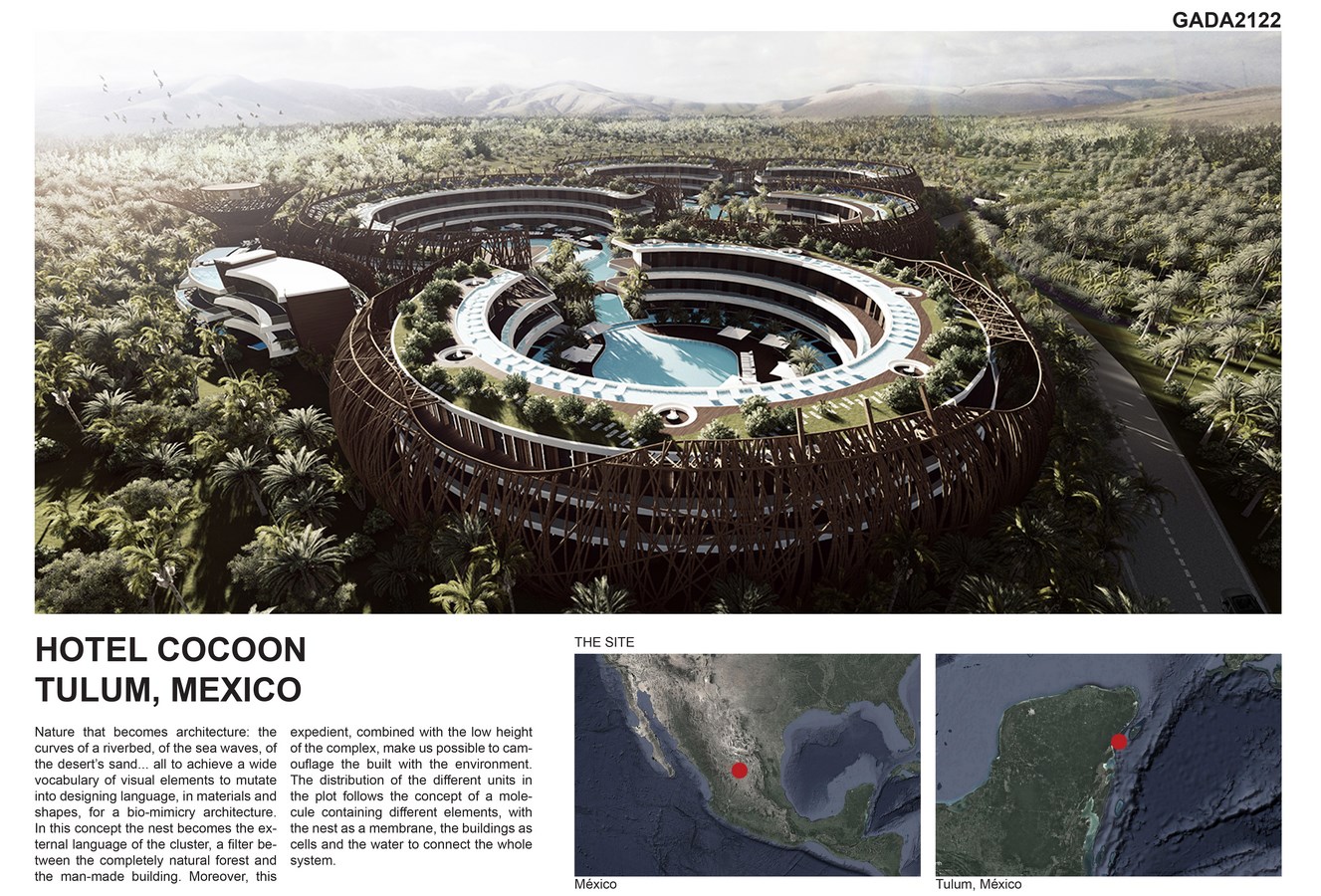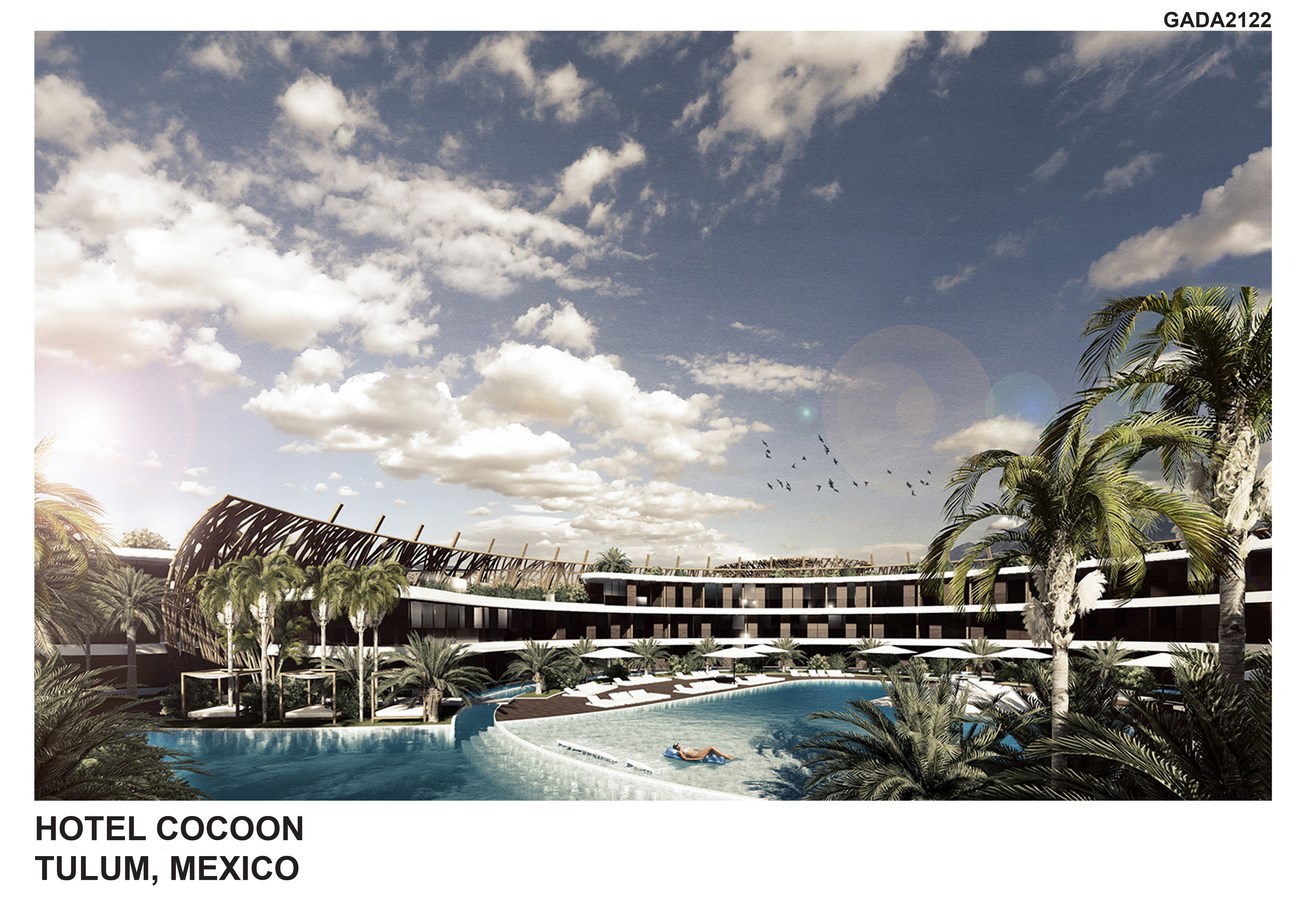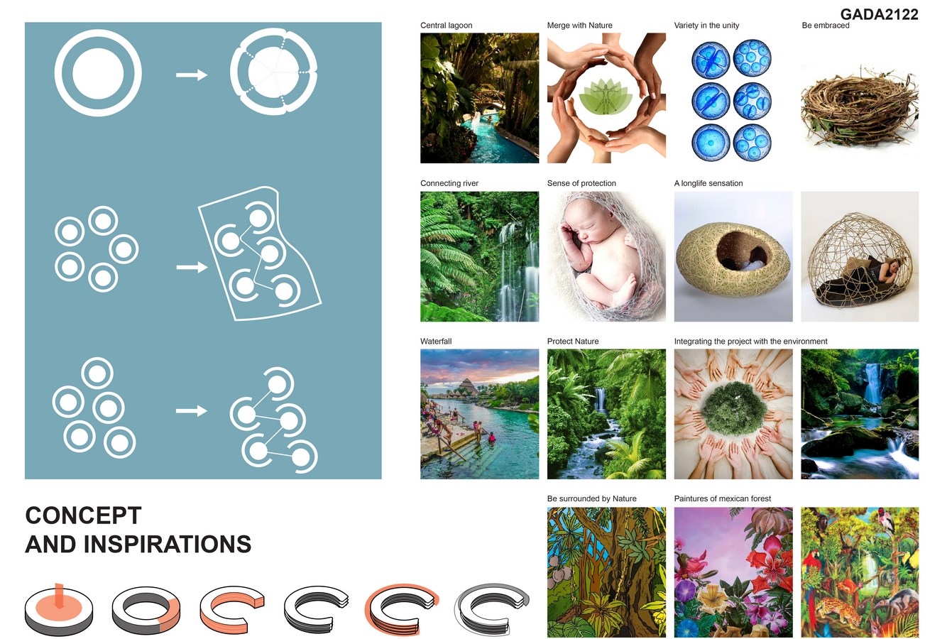 Quintana Roo, a state in the Mexican federation, was one of the last region inhabited by the Mayas, where they built important cities, today still well preserved. The coastal region is one of the protagonist tourism developments along the Mexican Caribbean coastline and its short distance from Cancún and the surrounding “Riviera Maya” has made it a popular tourist site in the Yucatan region. Surrounded by the Mexican forest with indigenous plant life and only around a kilometre away from the seaside, “Cocoon”, a concept for an eco-friendly resort is landed. Inspired by the primordial sensation of the nest and the need of protection, we wanted to design a space where people feel embraced, protected, giving the possibility to reconnect with the inner self or with the community.