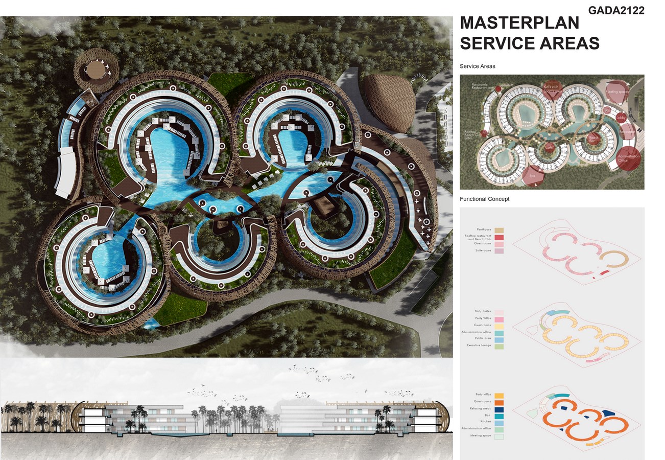The intermediate floor consists of guest rooms and an executive lounge, exclusive for meetings or important hosts. All the rooms are closed to the forest side, where the main corridor takes place, but open to the internal garden, where every room is provided with a private pool. This decision was made on purpose, feeding the guests with enough curiosity to live and enjoy the rooftop, where a garden roof and a 360 degrees breath-taking view of the paradisiacal Mexican forest will amaze them. The internal courtyard is divided into 5 main areas comprehensive of one kids’ swimming pool, two other swimming pools, one island dedicated to the beach bar and one for the cafe’. All the islands are connected by bridges, letting the people free to swim underneath from (and to) every part of the complex. The total built area is 36.781 square meters on an available surface of 39.820 square meters, allowing the distribution, apart from the amenities, of 240 guest rooms, 24 suites, 7 penthouses and 9 party villas.