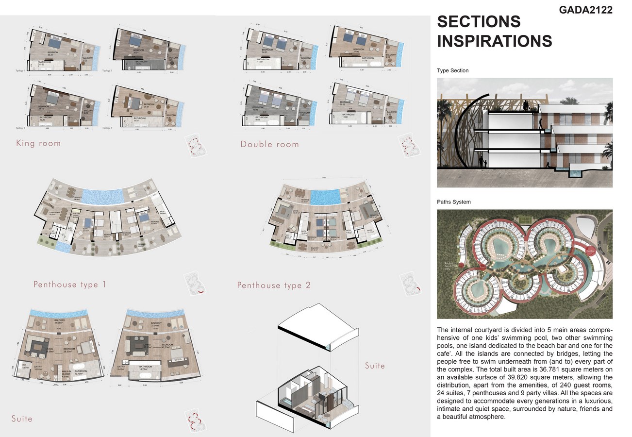 This expedient, combined with the low height of the complex, make us possible to camouflage the built with the environment, letting the nearby Mayan buildings to stand out attracting the deserved attention. The distribution of the different units in the plot follows the concept of a molecule containing different elements, with the nest as a membrane, the buildings as cells and the water to connect the whole system. At the ground floor, the internal spaces make a frame for the internal garden: the main utilities are located here such as the main lobby, the cafe’, the restaurant, the spa, the beach bar, the kids club, the meeting and conference spaces and much more, plus the first round of rooms.