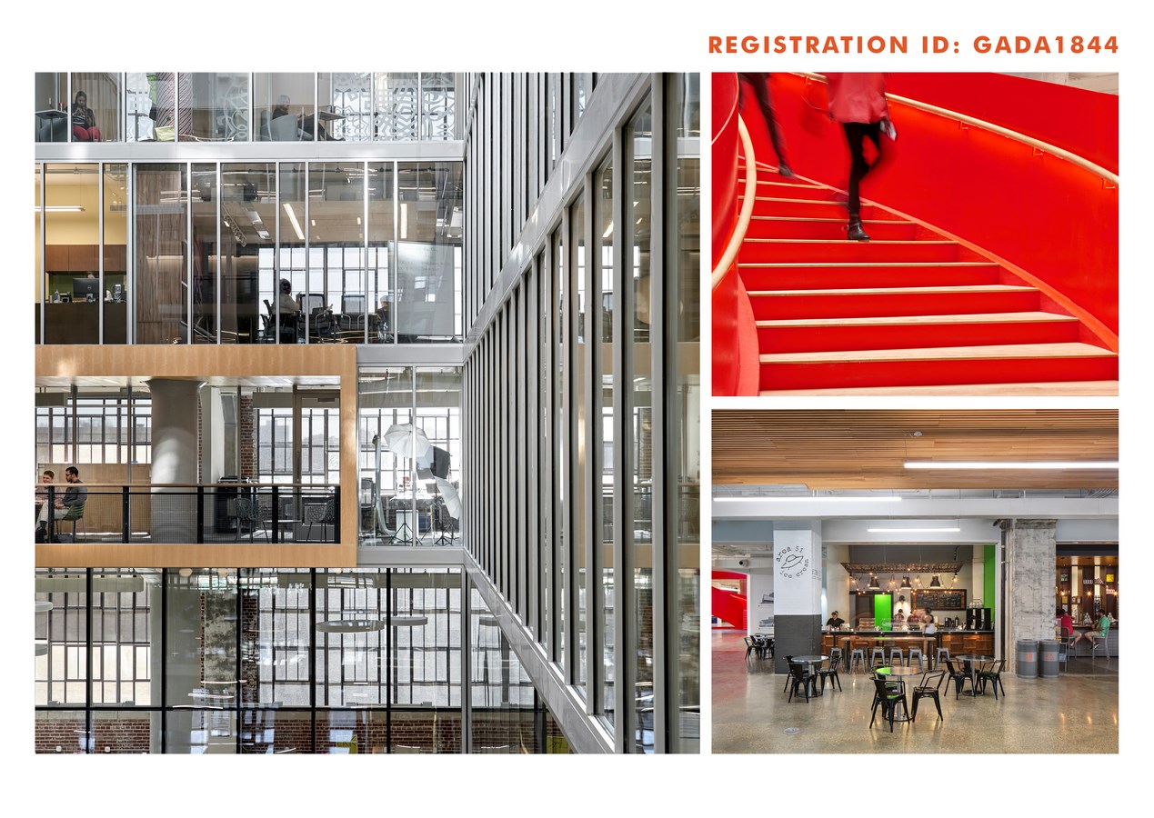 Drawing inspiration from the eight-story spiral package chutes that served as the backbone for the former Sears distribution, the east atrium has been crafted as a vertical column of light punctuated by a fluorescent red spiral stair. The fluorescent red demands attention and exploration, driving the curious to an unexpected art gallery.