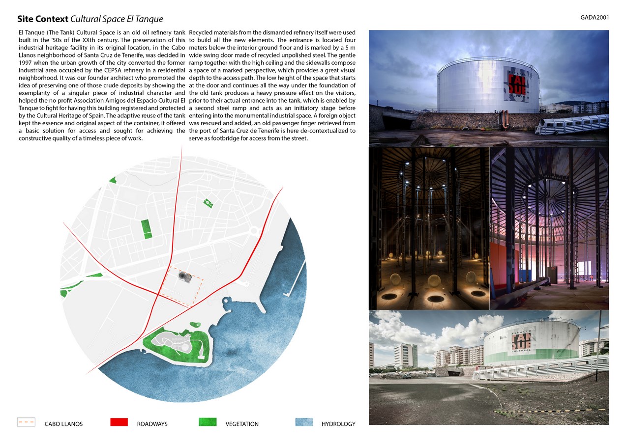 El Tanque (The Tank) Cultural Space, currently protected by the Cultural Heritage of Spain, is an old oil refinery tank built in the ’50s of the XXth century. The preservation of this industrial heritage facility in its original location, in the Cabo Llanos neighborhood of Santa Cruz de Tenerife, was decided in 1997 when the urban growth of the city converted the former industrial area occupied by the CEPSA refinery in a residential neighborhood.