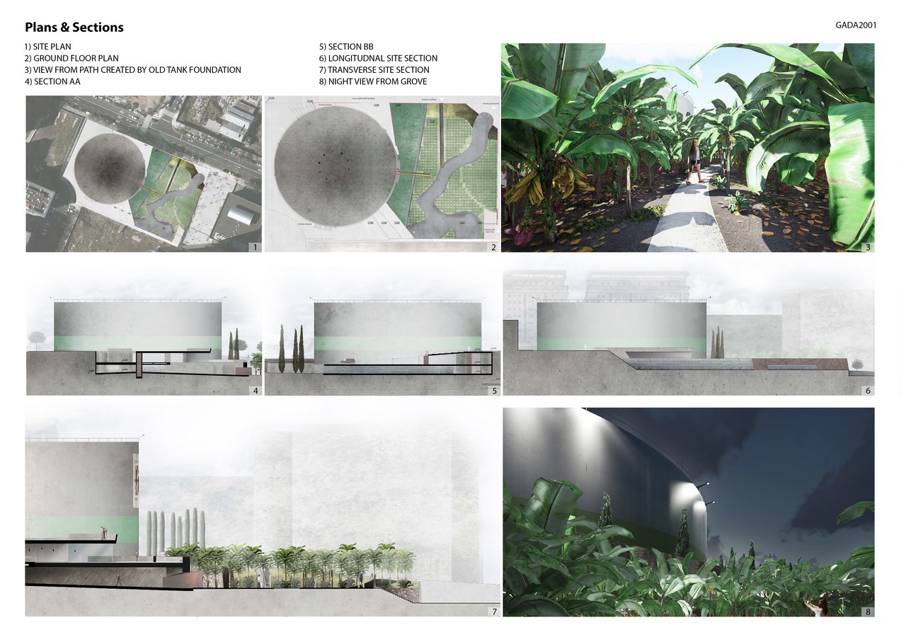 Our landscape design involves a botanical approach: There will be mostly, some 700 units, trees of Musa Paradisiaca, commonly known as banana trees. They grow fast, up to 7 m tall, and usually bloom in the summer. They need to face the sun so the chosen location is ideal for its climatology. Inside the perimeter of the original wall of the tank, cypress trees will be planted, which, like the great majority of conifers, are evergreen, growing up to 20 m high with a diameter of about 60 cm. Pyramid shaped and fast growing, the cypresses will allow, since their early life, to enjoy a green environment. In addition, responding to the current needs of El Tanque Cultural Space managers and its users, our design includes additional storage area, additional toilets, changing rooms, technical rooms and a cafeteria with terrace.