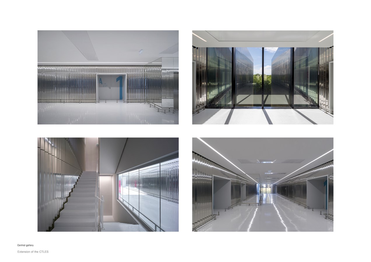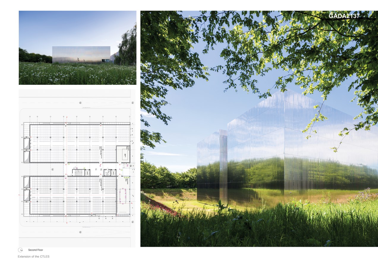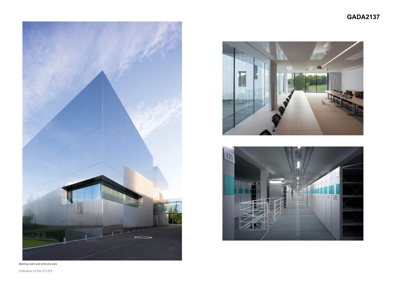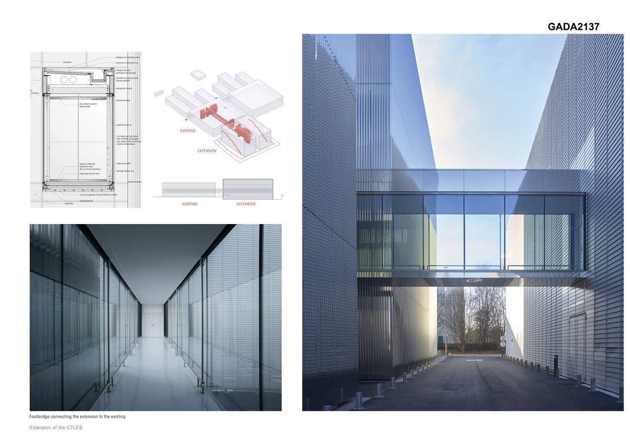 The first CTLES building imposes a strong identity on the site. From the point of view of both implementation, functional and architectural expression, the extension is designed in perfect continuity with the existing structure. As the building is set into the ground, the heights of the two structures are almost aligned.