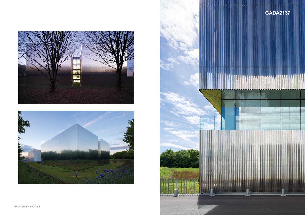 Reflecting its environment, stainless steel metamorphoses the image of the building. Undulating and reflective, the exterior facade vibrates with the outside; it evolves during the day and through the seasons according to natural daylight. Faceted by folds, it decomposes the landscape in a kinetic effect to sometimes make the building disappear.