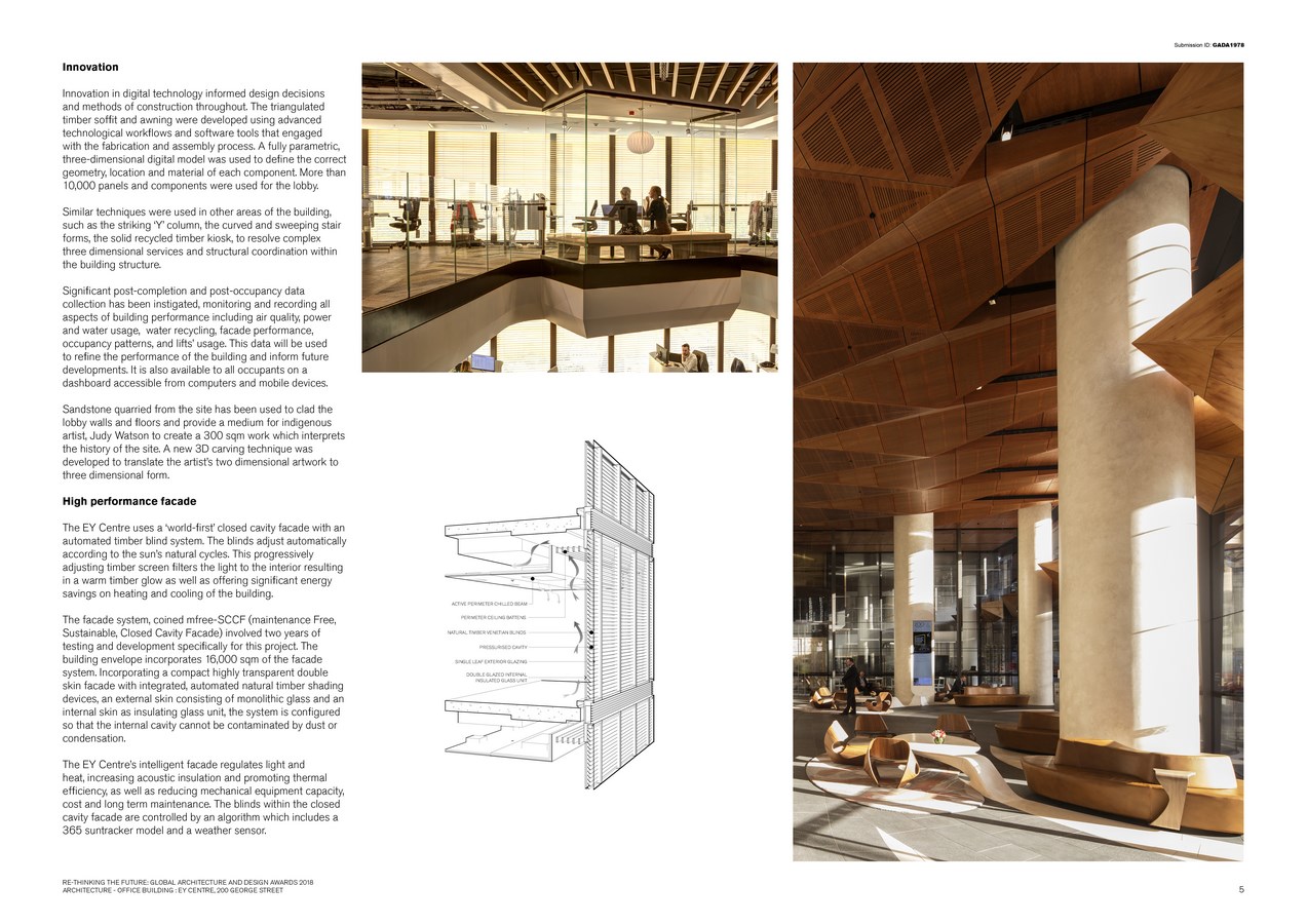 Embracing natural materials, it appears in the city as a tower made of timber rising out from the greyness of its neighbours. This is achieved through a facade made from multiple layers. The outer layer is a single sheet of low iron clear glass, behind which is a layer of automated louvres of natural timber, located within a sealed, air-pressured cavity that is clean and dust free, and finally the inner layer is a double glazed high performance insulating unit. The result is a facade that outperforms any of the surrounding grey glass buildings and looks nothing like them. It is clear and transparent and the natural colour of the wood glows in the sun.