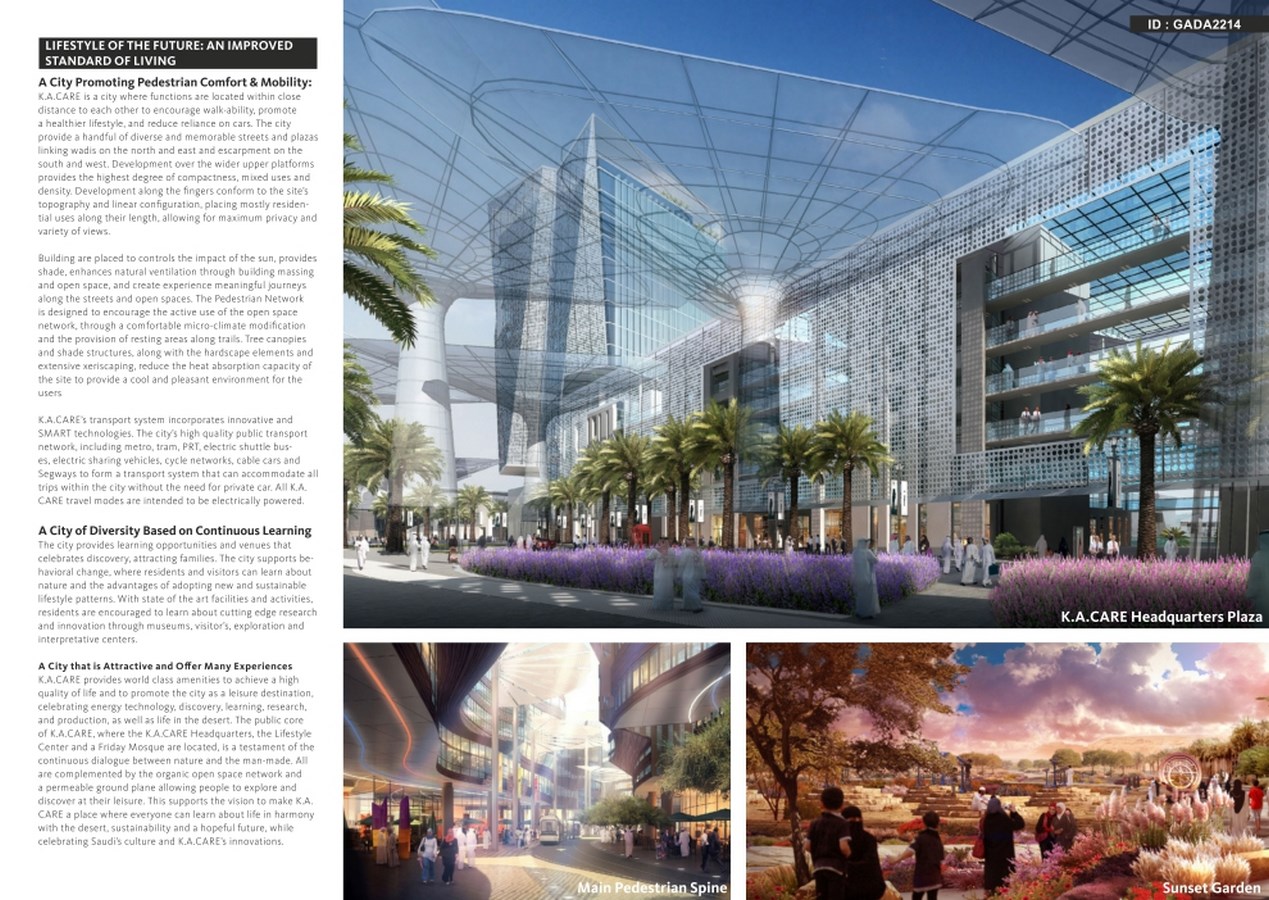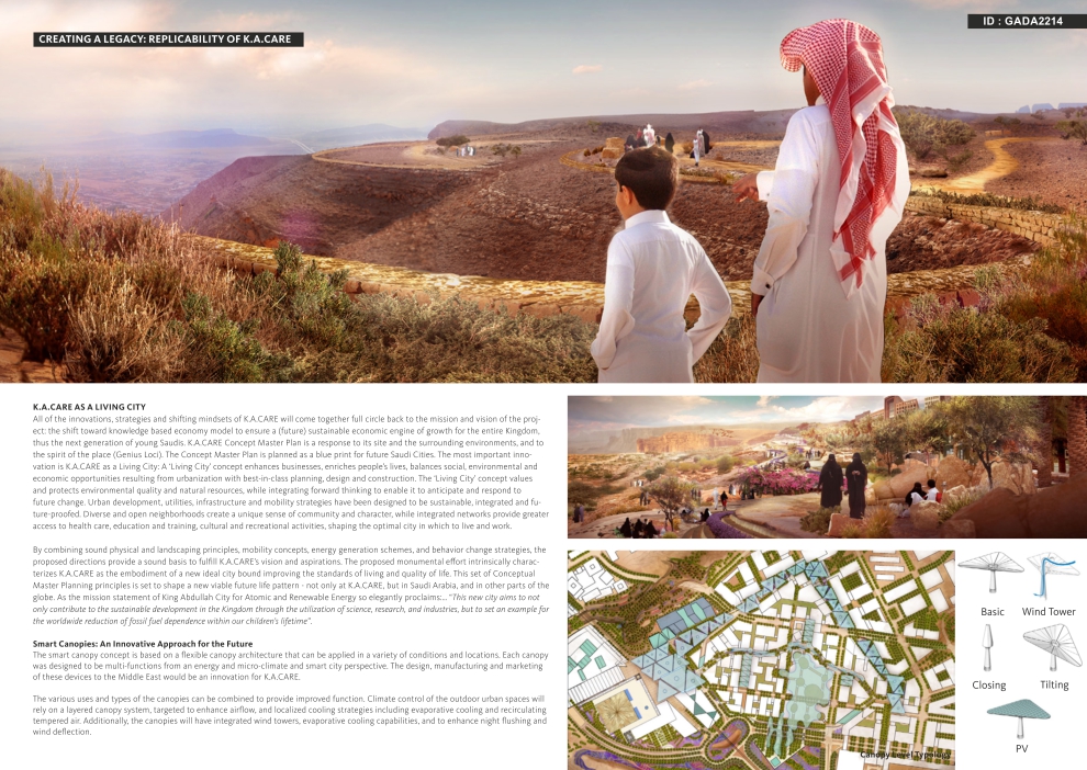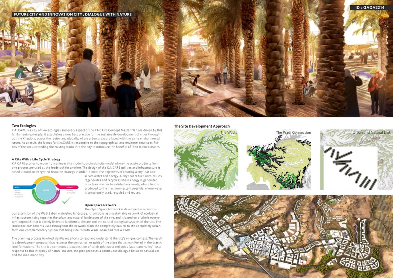 The concept master plan proposal for K.A.CARE is to create a City of Tomorrow: an innovative urban development that encourages interaction and innovation, that integrates new ideas and technologies into the planning, urban design, landscaping, building, transportation, infrastructure and social fabric of the community, while respecting and celebrating the delicate natural context where the city is placed. As a city that intends to attract talent, the proposal for K.A.CARE understands the specifics of its finite and vulnerable territory, and creates a place that can provide the emotional and sensory stimulation required to entice and stir creative thought and translate it into action.