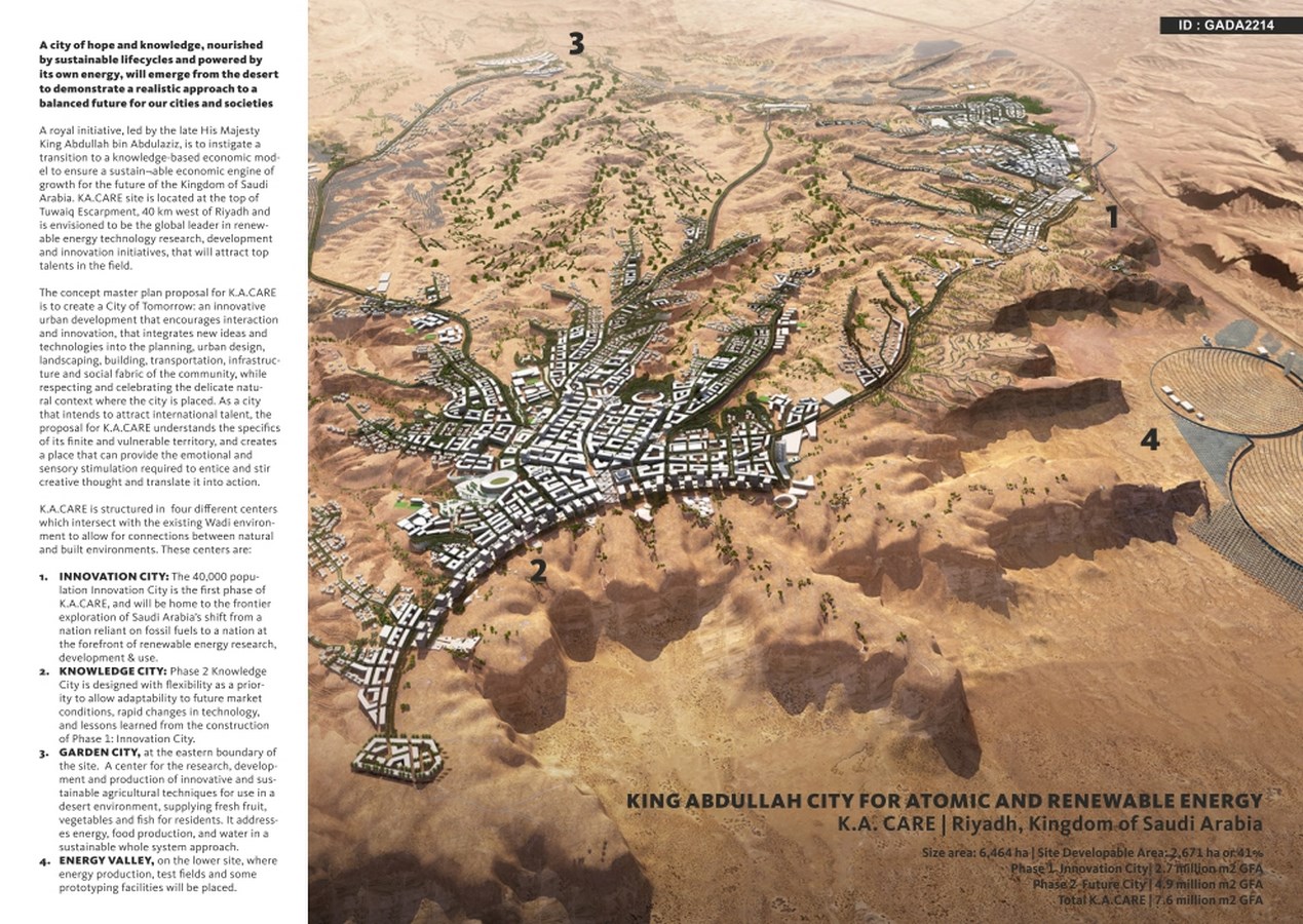 King Abdullah City for Atomic and Renewable Energy (KA.CARE), a city of hope and knowledge, nourished by sustainable lifecycles and powered by its own energy, will emerge from the desert to demonstrate a realistic approach to a balanced future for our cities.