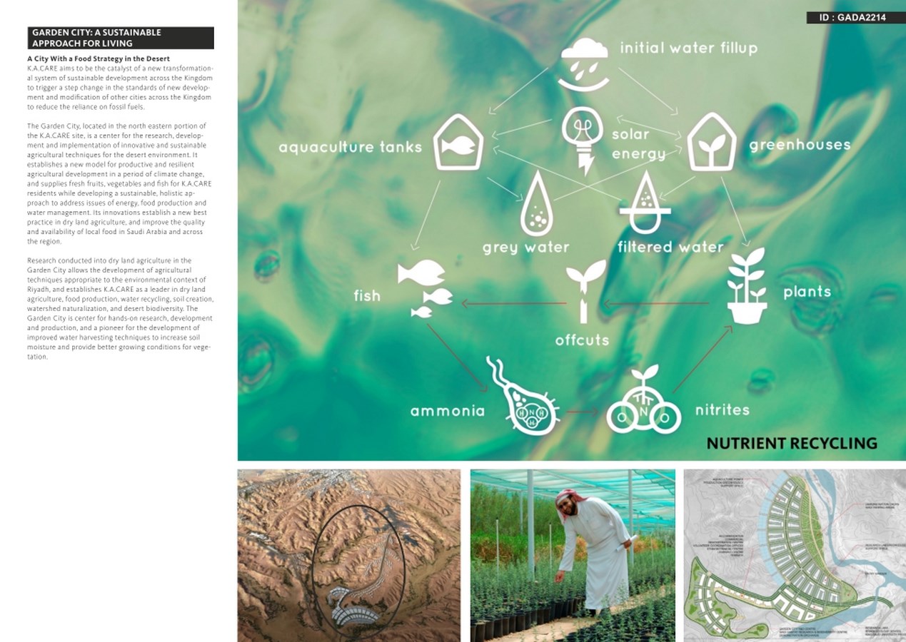 GARDEN CITY, at the eastern boundary of the site. A center for the research, development and production of innovative and sustainable agricultural techniques for use in a desert environment, supplying fresh fruit, vegetables and fish for residents. It addresses energy, food production, and water in a sustainable whole-system approach.