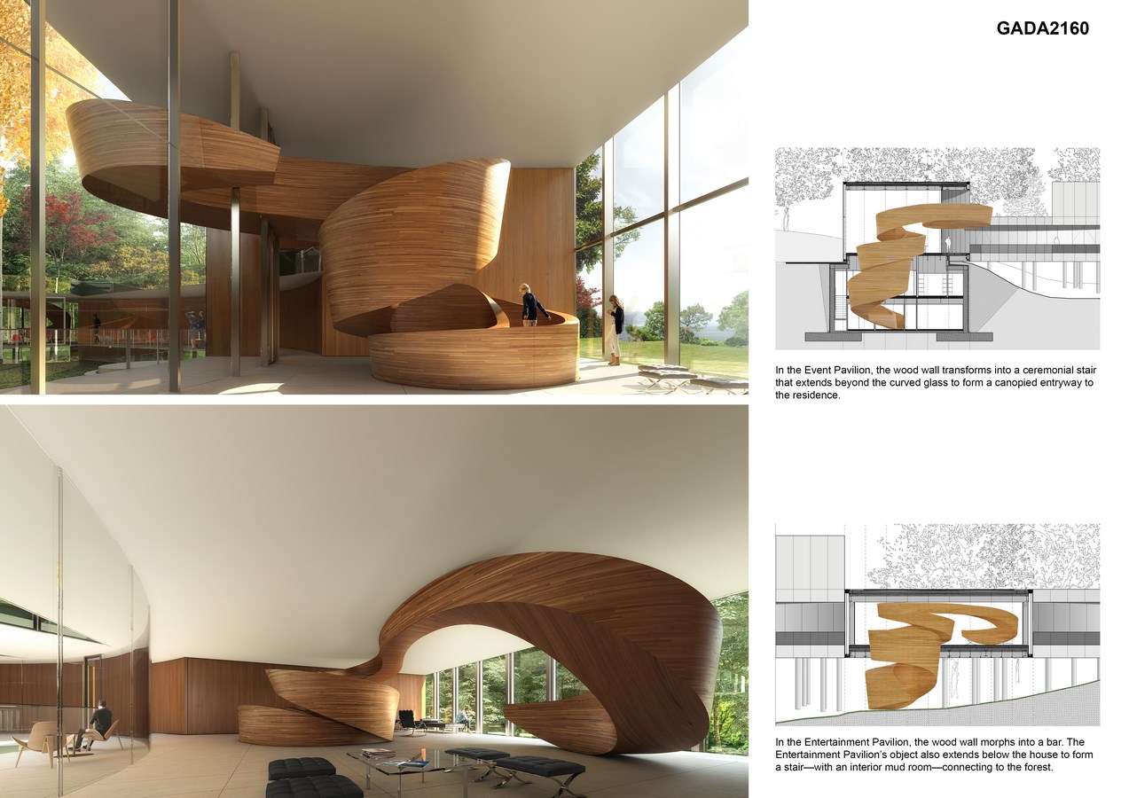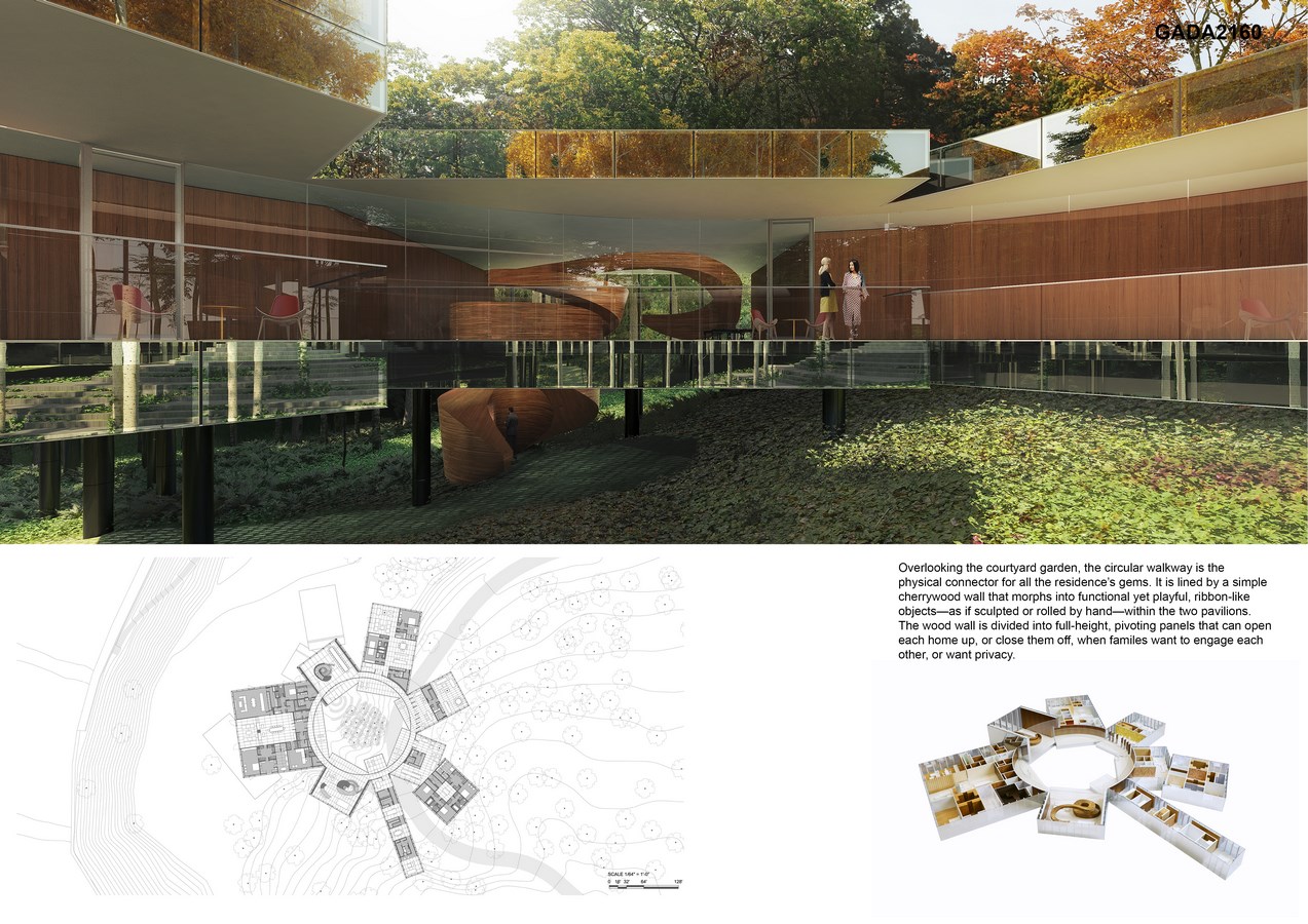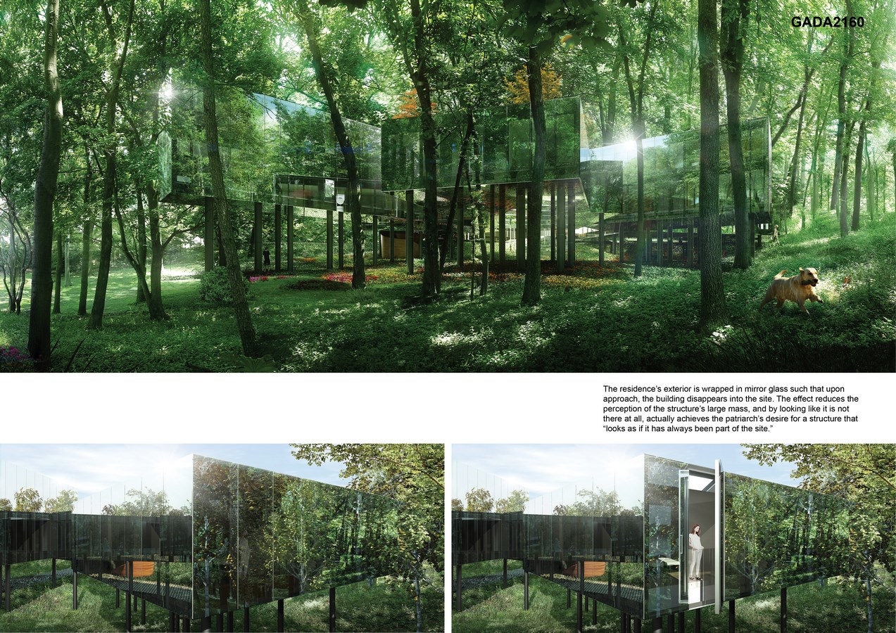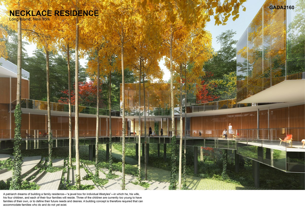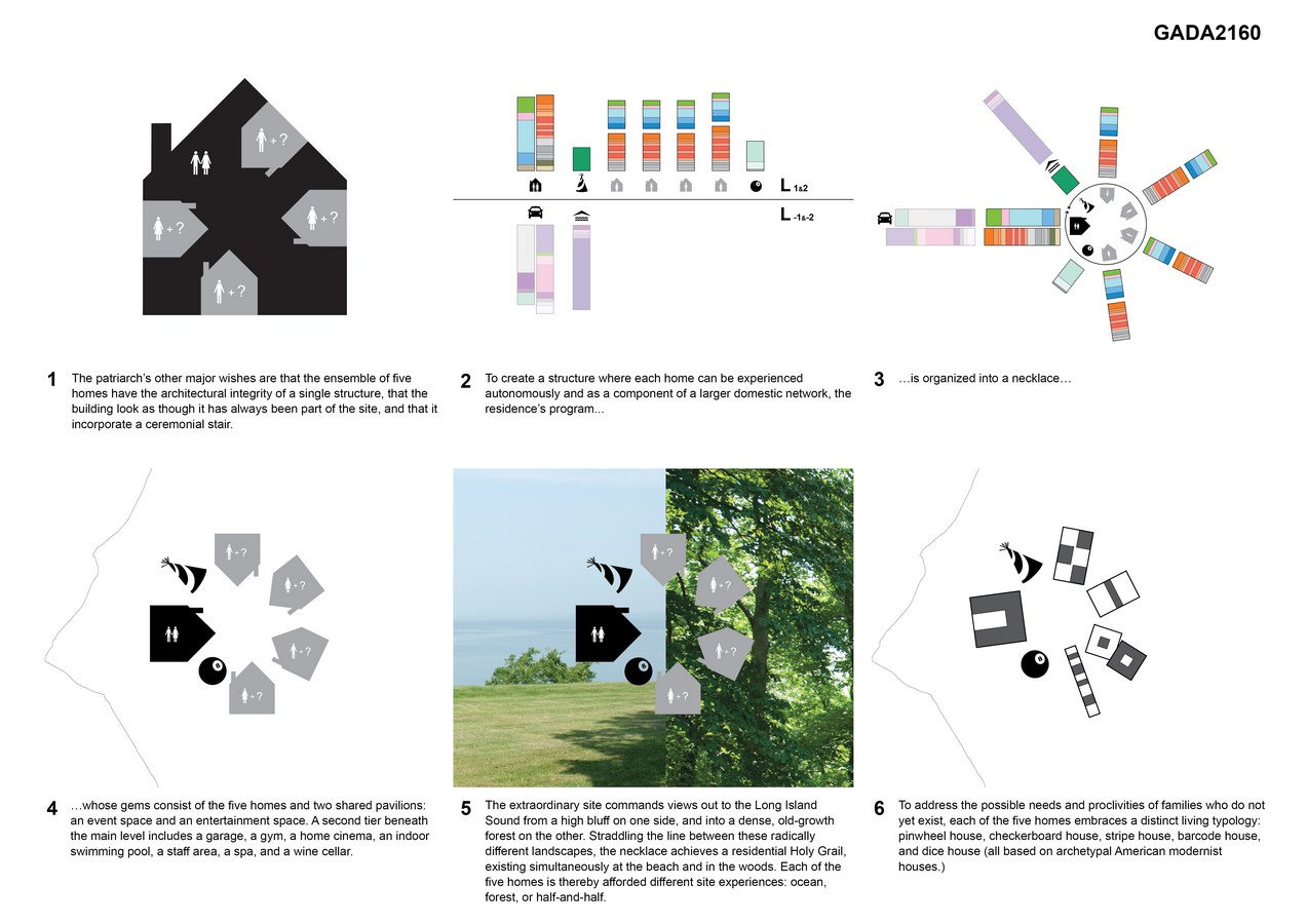 A patriarch dreams to build a family home—”a jewel box for individual lifestyles”—in which he, his wife, and his four children’s future families will reside. Three of the children are currently too young to have families of their own or to define their future needs and desires. A building concept is thereby required that can accommodate families that do—and do not yet—exist. The patriarch’s other major wishes are that the ensemble of five homes has the architectural integrity of a single structure, that the building look as though it has always been part of the site, and that it incorporate a classic double stair.