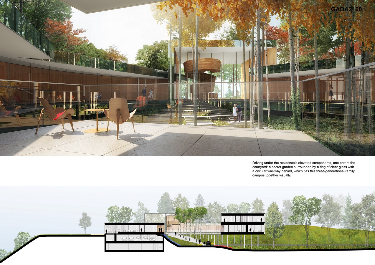 While the ocean-side portions of the residence are on grade, due to the site’s steep drop-off, the forest-side portions extend horizontally into the tree canopy, giving these elements a tree-house experience. Entry is gained by driving under the residence’s elevated components into a secret garden at the building’s heart. To accommodate the possible needs and proclivities of families which do not yet exist, the five homes are designed as unique gems on the necklace, each with a distinct living typology based loosely upon one of five canonical, American Modernist homes. Should the four children and their families live permanently at the residence, the palette of homes will provide options to which each child—with his or her family’s future lifestyle preferences—might gravitate. Should the four children and their families only make frequent visits to the residence, they can enjoy alternate architectural and site experiences each stay.