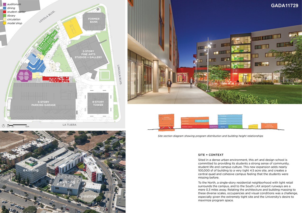 To the North, a single-story residential neighborhood with light retail surrounds the campus, and to the South LAX airport runways are a mere 0.3 miles away. Relating the architecture and building massing to these diverse scales, occupancies and visual conditions was a challenge, especially given the extremely tight site and the University’s desire to maximize program space.