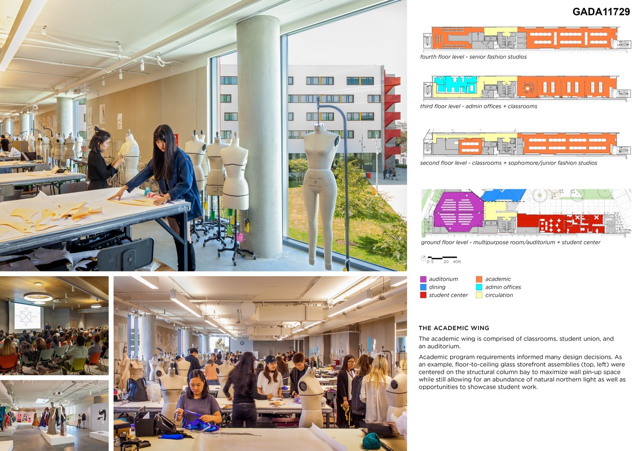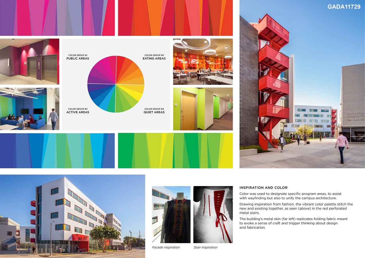 Color was used to designate specific program areas, to assist with wayfinding but also to unify the campus architecture. Drawing inspiration from fashion, the vibrant color palette stitch the new and existing together, as seen (above) in the red perforated metal stairs. The building’s metal skin (far left) replicates folding fabric meant to evoke a sense of craft and trigger thinking about design and fabrication.