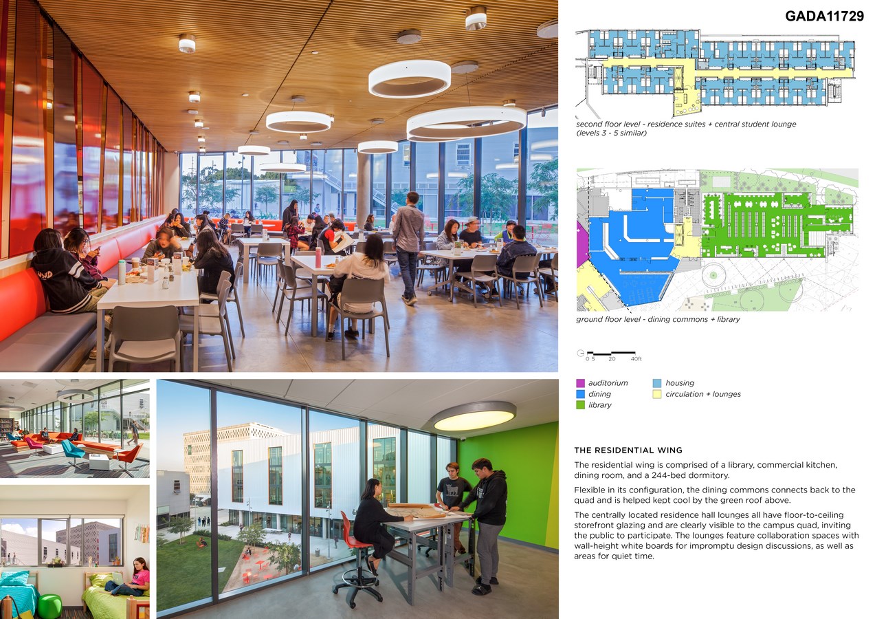 The residential wing is comprised of a library, commercial kitchen, dining room, and a 244-bed dormitory. Flexible in its configuration, the dining commons connects back to the quad and is helped kept cool by the green roof above. The centrally located residence hall lounges all have floor-to-ceiling storefront glazing and are clearly visible to the campus quad, inviting the public to participate. The lounges feature collaboration spaces with wall-height white boards for impromptu design discussions, as well as areas for quiet time.