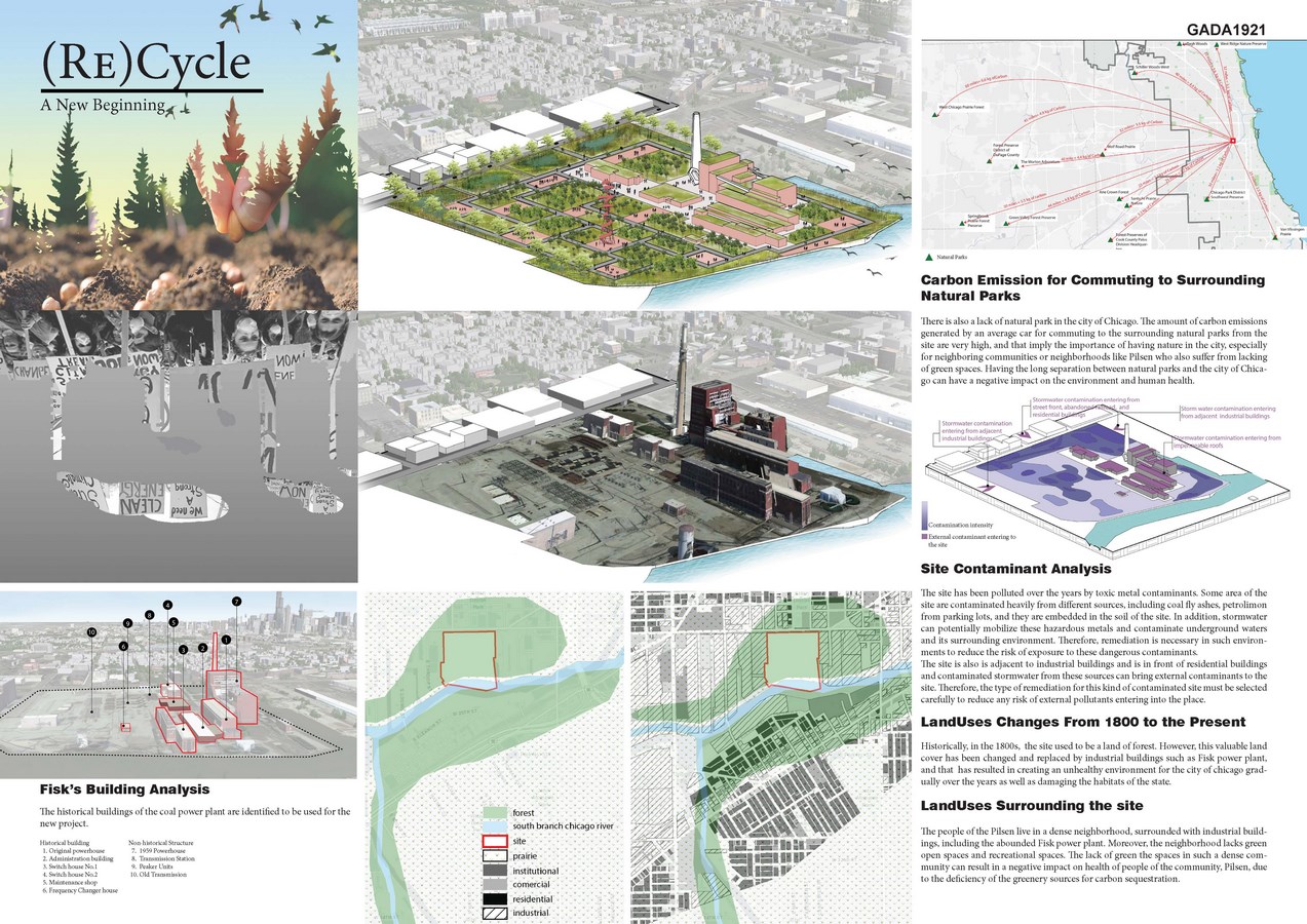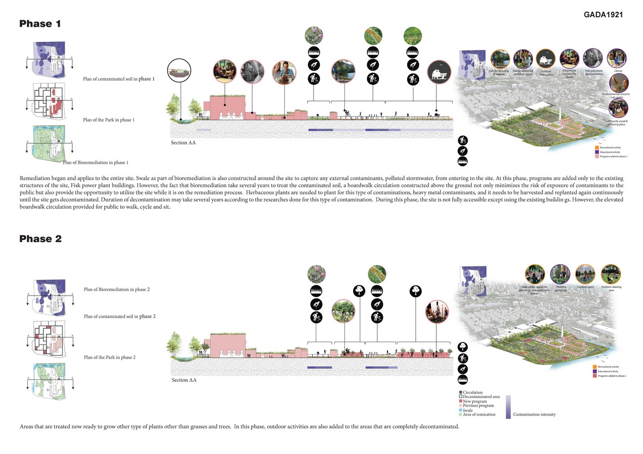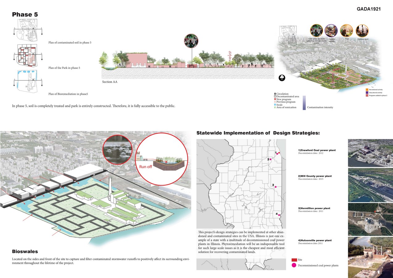 This project explores phased phytoremediation for the highly contaminated Fisk Coal Power Plant, an abandoned brownfield in Chicago, and its transformation into a public park that will contribute to enhancing the quality of the urban environment, and provide a vibrant new cultural and recreational facility for the city. Preserving some of the existing buildings of the former power plant as a symbol of the industrial Chicago, the project incorporates a variety of cultural and educational programs with the intention of creating public awareness about questions of urban nature and environmental preservation. Altogether, once completed, this project can be an example to demonstrate that abandoned sites can be recovered to become a focal point to help their surrounding environment and communities in many ways. This project’s design strategies can be implemented at other abandoned and contaminated sites in the USA. Illinois is just one example of a state with a multitude of decommissioned coal power plants. Phytoremediation will be an indispensable tool for such large-scale issues as it is the cheapest and most efficient solution for recovering contaminated lands.