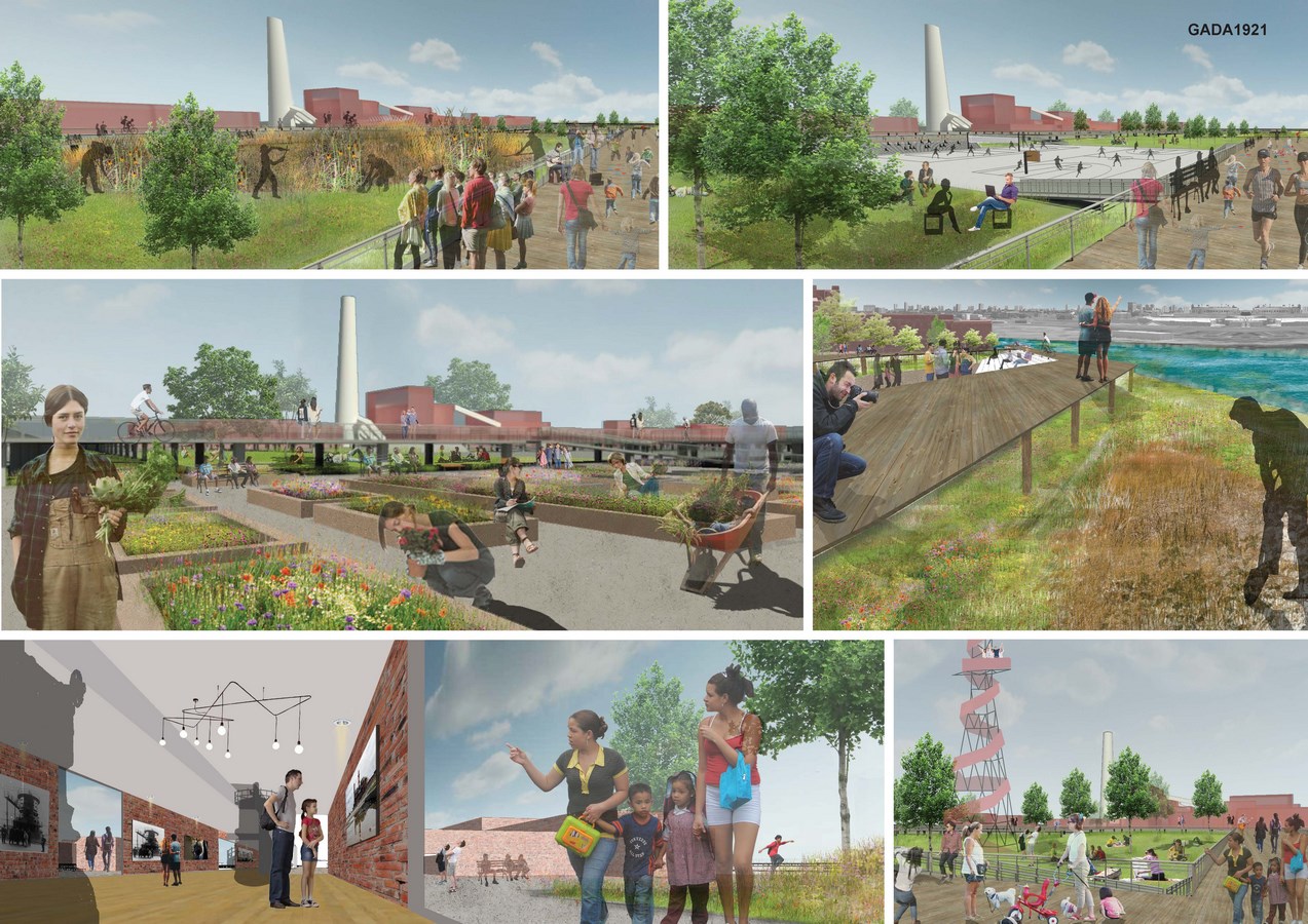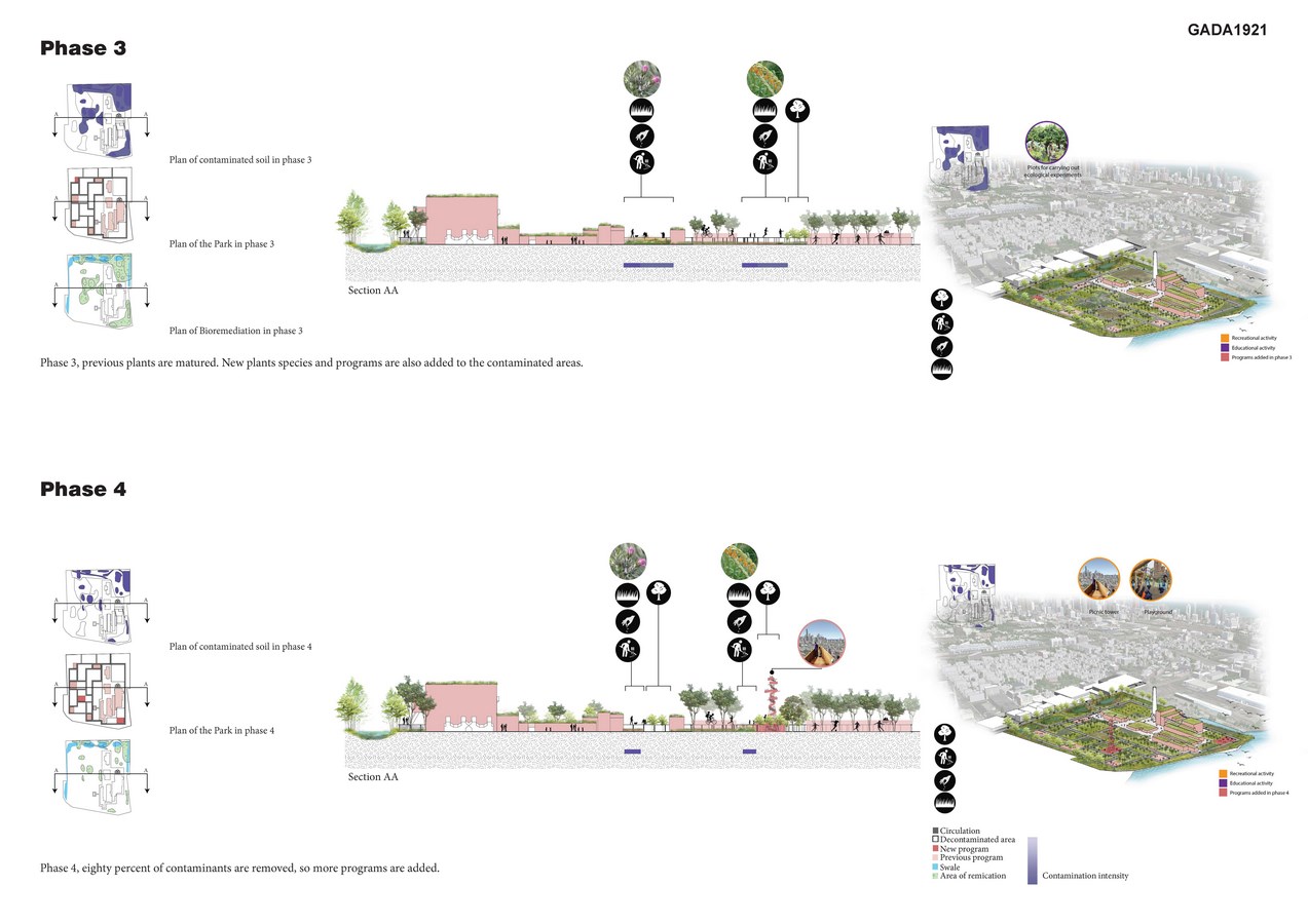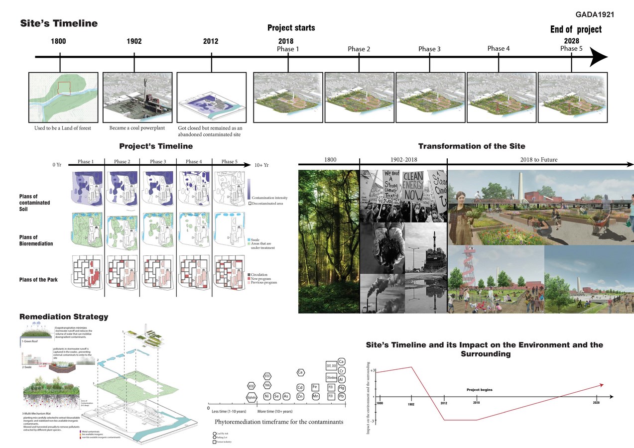 This project explores phased phytoremediation for the highly contaminated Fisk Coal Power Plant, an abandoned brownfield in Chicago, and its transformation into a public park that will contribute to enhancing the quality of the urban environment, and provide a vibrant new cultural and recreational facility for the city. Preserving some of the existing buildings of the former power plant as a symbol of the industrial Chicago, the project incorporates a variety of cultural and educational programs with the intention of creating public awareness about questions of urban nature and environmental preservation. Altogether, once completed, this project can be an example to demonstrate that abandoned sites can be recovered to become a focal point to help their surrounding environment and communities in many ways. This project’s design strategies can be implemented at other abandoned and contaminated sites in the USA. Illinois is just one example of a state with a multitude of decommissioned coal power plants. Phytoremediation will be an indispensable tool for such large-scale issues as it is the cheapest and most efficient solution for recovering contaminated lands.
