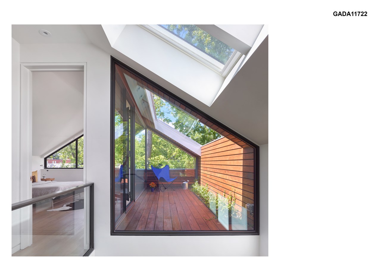 Although the house is only 2,420 square feet, it feels much larger—its rooms expand beyond the interior to a series of useable outdoor spaces that enrich the domestic experience, each with its own unique character and varying level of privacy. The rear yard is landscaped and features a generously scaled thermally-treated ash wood deck, and a few steps down, another zone defined by granite pavers is planted with a row of honey locust trees that offer dappled light and shade in summer. Even the existing porch at the front of the house is remade into a private outdoor dining room enclosed by a five-foot-high wood screen, extending the private realm into the public arena. On the third floor, two outdoor spaces provide green respite. An exposed roof deck at the back of the house has plentiful views over the neighbourhood and into the extensive green canopy surrounding the house. At the front of the house, half of the master bedroom is given over to an intimate exterior space clad in the warm ash, with a recessed planter and an opening carved into the roof for natural light, access to rainwater, and ample views of green. Intimately connected to the master suite, this “skygarden” functions as a unique outdoor room, open to the sky, sun, wind and stars.