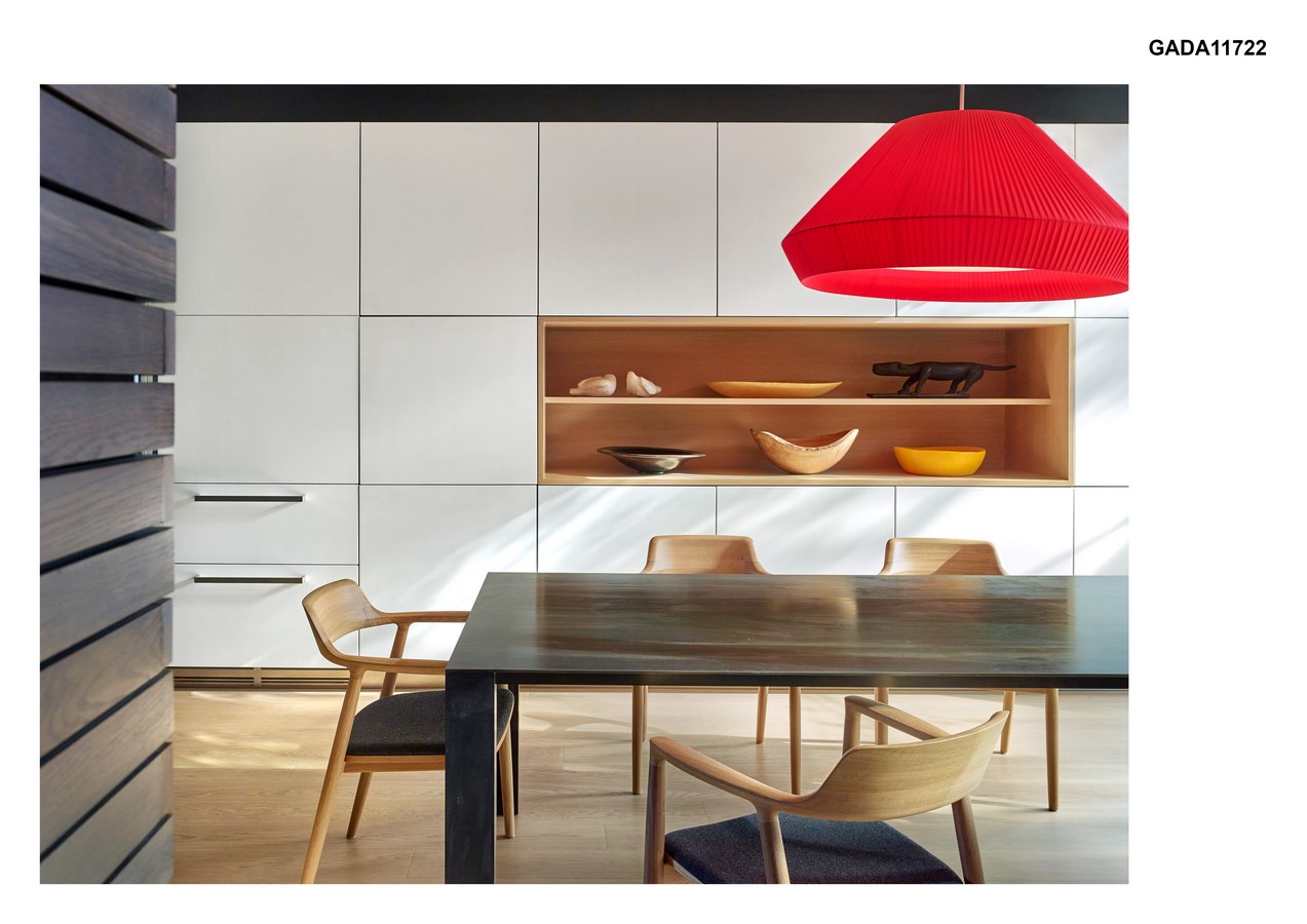 The complete overhaul of the house resulted in a significant reduction in its ecological footprint. To achieve the most efficient methods of heating, cooling and lighting while minimizing costs, the mechanical and electrical systems are integrated with passive design strategies. Highly efficient infloor radiant heating, high velocity cooling systems, superior insulation, and energy-saving fixtures and appliances were introduced, and combined with passive sustainable systems to optimize energy use in all seasons. The open plan is organized around a central vertical volume containing the sculptural open-riser stair.