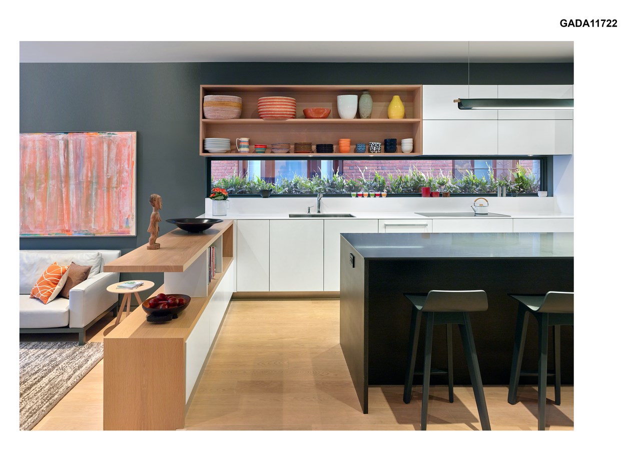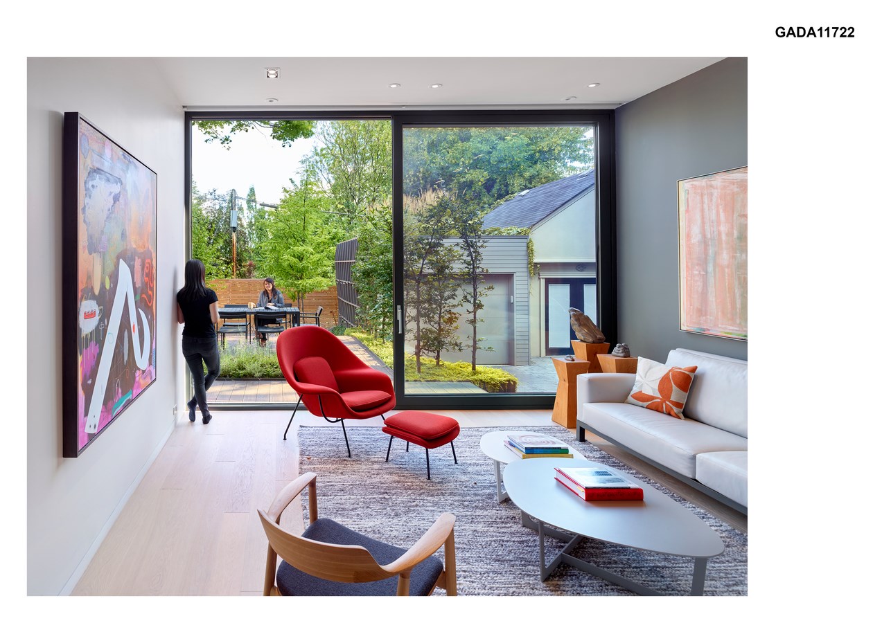 A large operable skylight above draws natural light deep into the interior and improves natural ventilation through stack effect, reducing the need for air conditioning. The abundance of glazing coupled with the house’s east-west orientation results in plenty of natural light at all hours of the day, decreasing the need for artificial lighting. Site vegetation screens the west façade to mitigate glare and excessive heat gain in summer months, but in winter, when the leaves are gone, solar gain from low sun is encouraged to help heat the house. Skygarden House is a modern home that considers the context of the street and carefully reimagines its interior spaces and their relationship to the outdoors.
