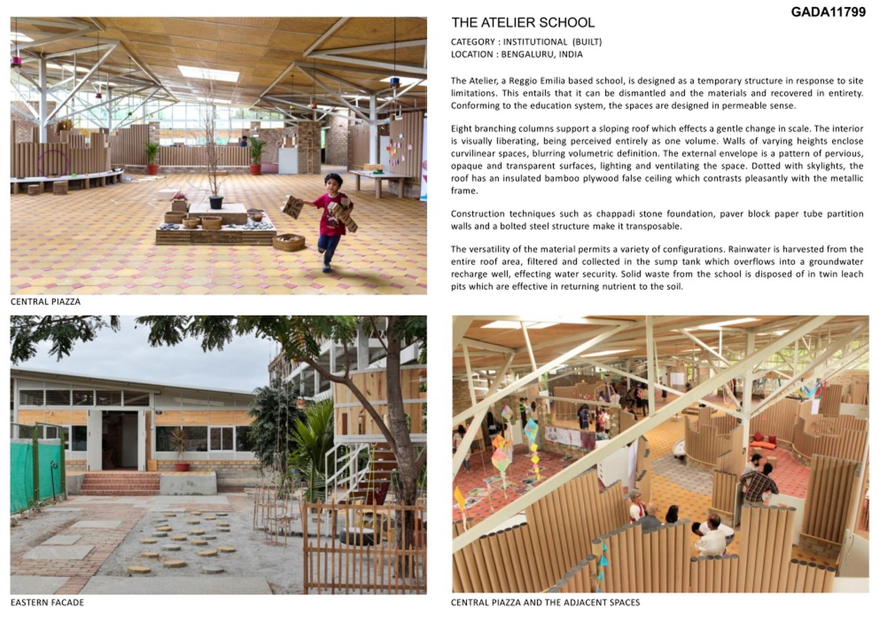 Various building techniques make the design economical and recoverable to the maximum – chappadi granite stone slab foundation, paver block flooring, paper tube partition walls, and bolted steel supports – creating a structure that can be transposed. The external fabricated façade is a tack-welded mild steel frame with panels of perforated metal sheet, pinewood, reflective glass, operable louvres and sliding windows, planned with regard to light and ventilation. CSEBs made of soil from different sites in the locality create pleasing patterns which harmonize with the floor colours. GI sheet is used in consideration to the roof slope, with a false ceiling of bamboo mat plywood for thermal and sound insulation, which further imparts a sense of warmth. Preference of a hand-crafted material such as bamboo mat over the conventional plywood allows a valuable skill to be preserved.