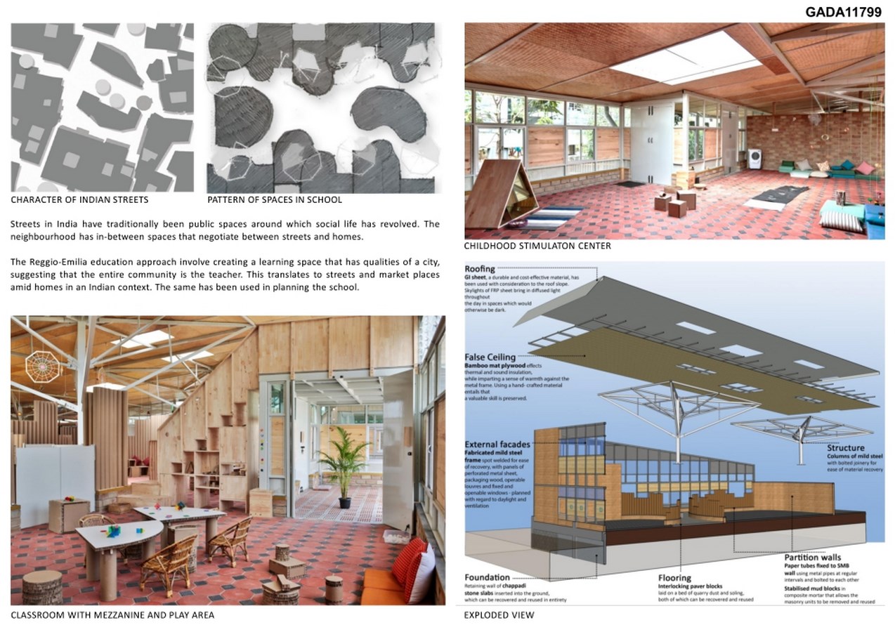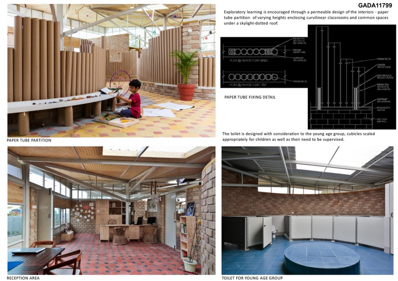 The school sits in a neighbourhood with constant construction activity and a godown is in its immediate vicinity. Creating a learning space for a young age group on such a site required that the school be an enclosed and protective space. The site factor played a key role in the design, along with the Reggio-Emilia education approach itself, on which the school is based.