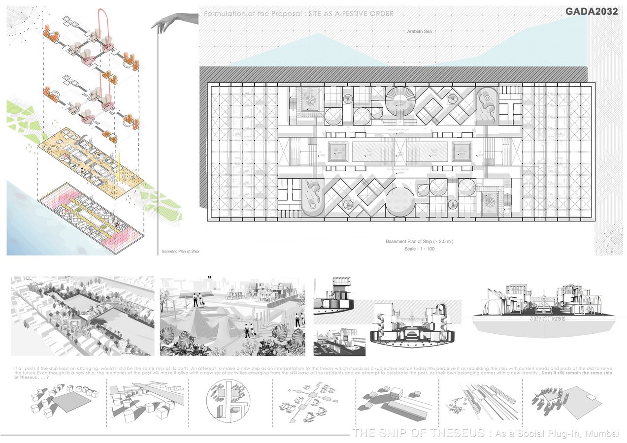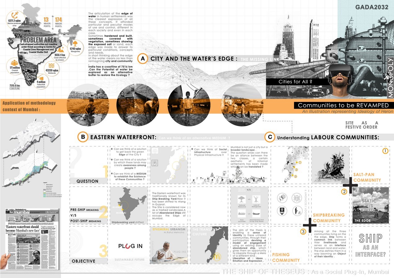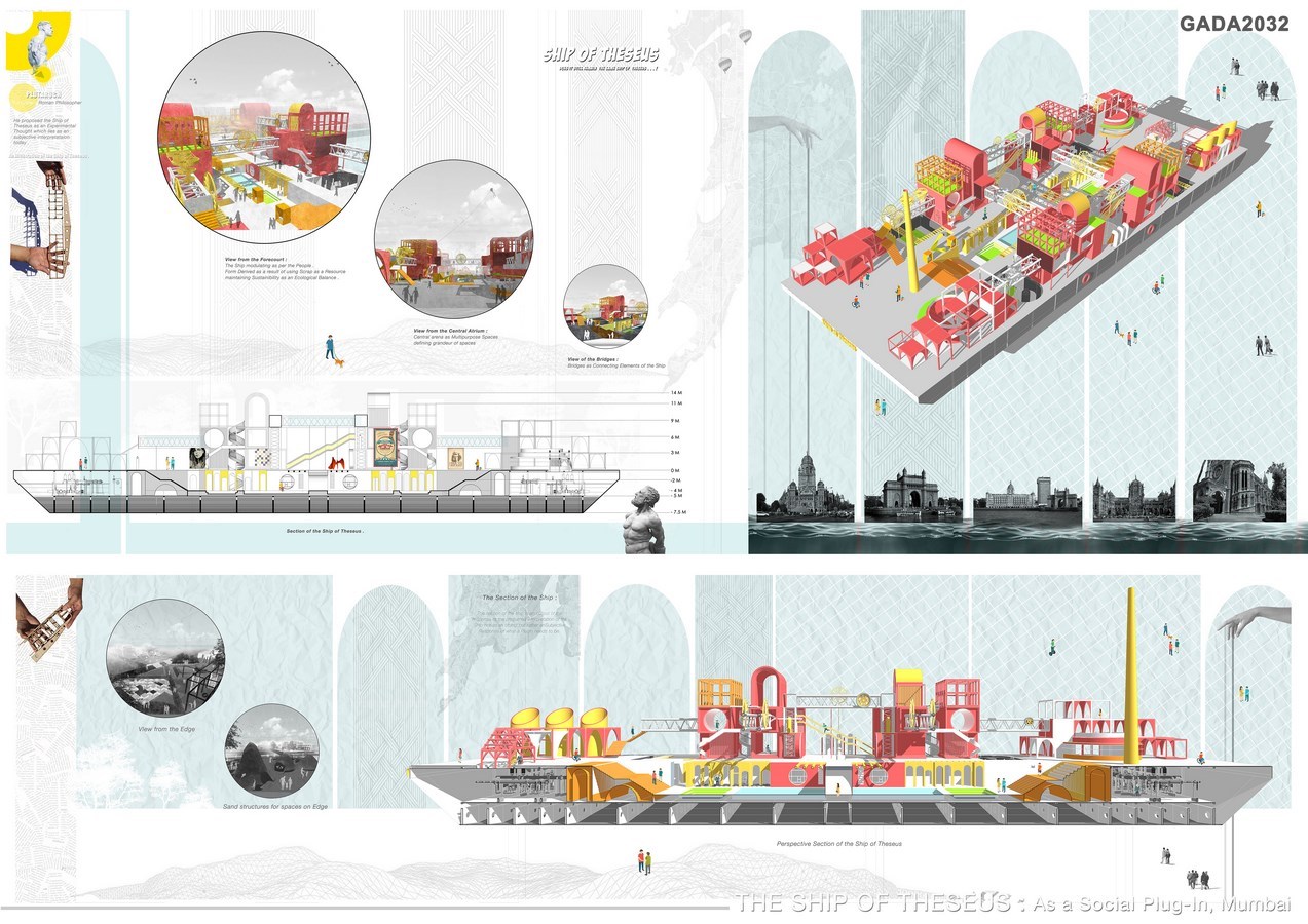 - This proposal is a device, a thought experiment, enabling the potential of an edge to be explored beyond the limitations of Mumbai’s industrial sprawl ambitions .For the project, Mumbai is revisited to capitalise from the economy of ‘happiness’ as an alternative industry using SHIP OF THESEUS as a metaphorical protagonist for identity.
