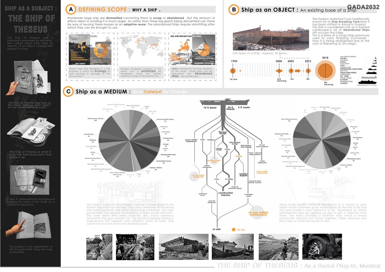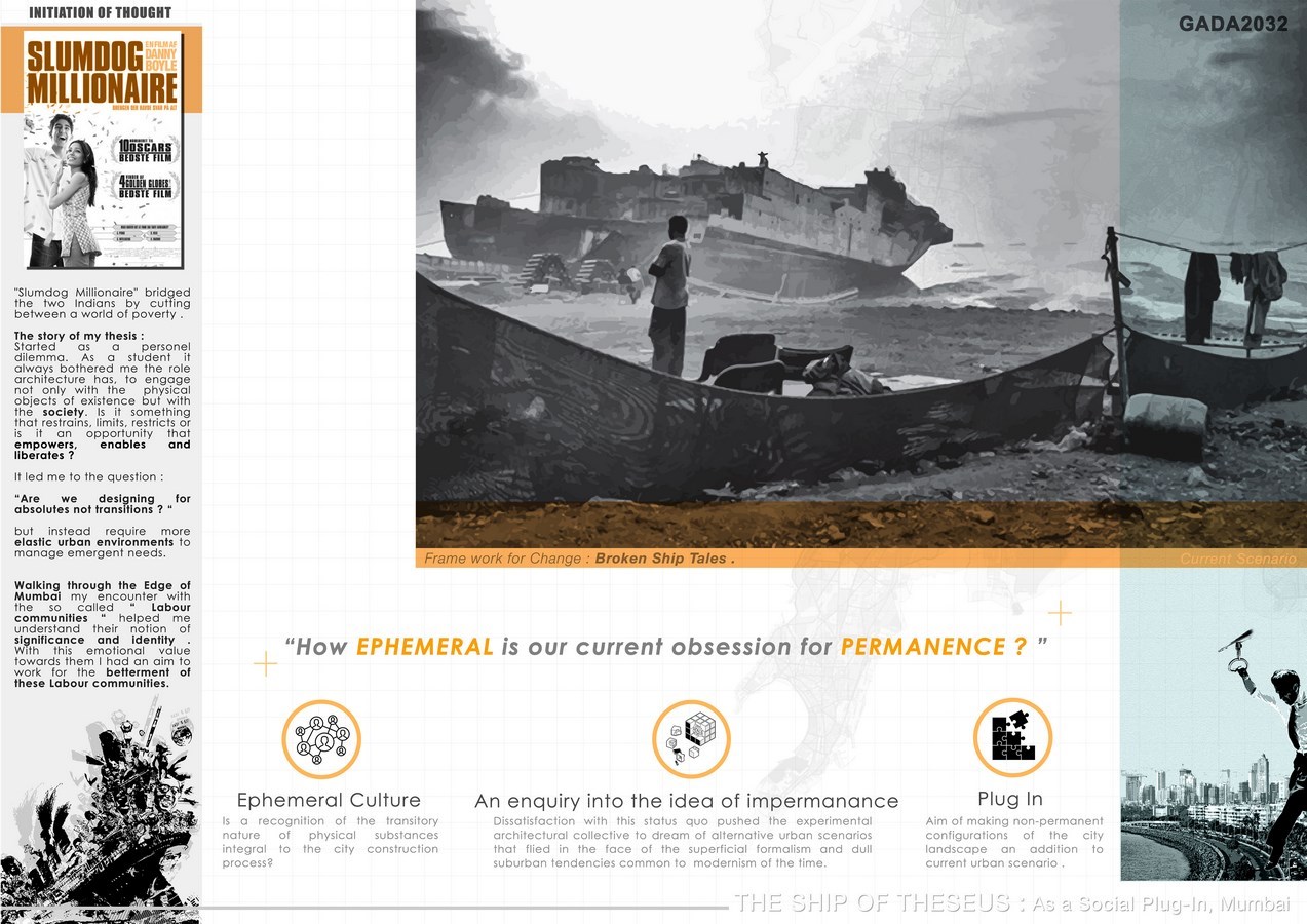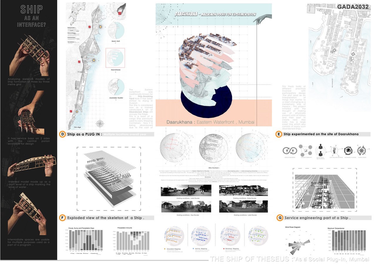 - This proposal is a device, a thought experiment, enabling the potential of an edge to be explored beyond the limitations of Mumbai’s industrial sprawl ambitions .For the project, Mumbai is revisited to capitalise from the economy of ‘happiness’ as an alternative industry using SHIP OF THESEUS as a metaphorical protagonist for identity.