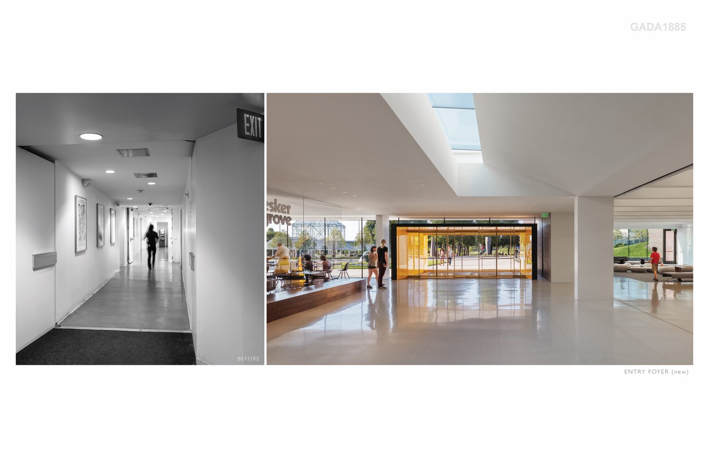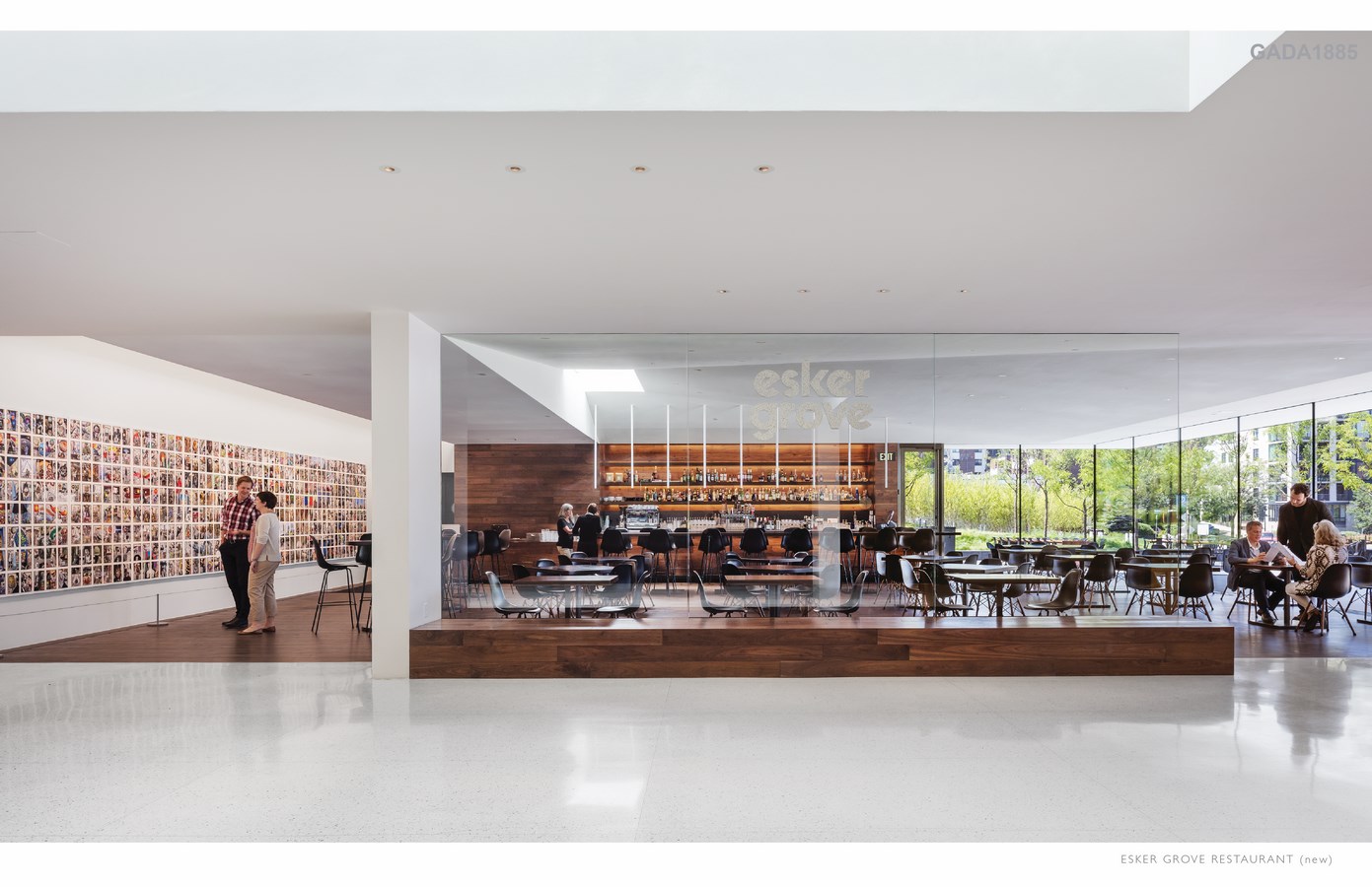The project includes a new 5,500-square-foot entry pavilion containing a new restaurant and kitchen, entry vestibule, foyer and green roof. The project also includes a 15,200-square-foot renovation of the main lobby, parking entry and mechanical rooms, and a complete reclad of the existing Barnes brick building to bring the modernist landmark up to contemporary energy codes and performance. Finally, the Walker’s previously incomplete upper garden was renovated and integrated into the newly unified 19-acre campus.