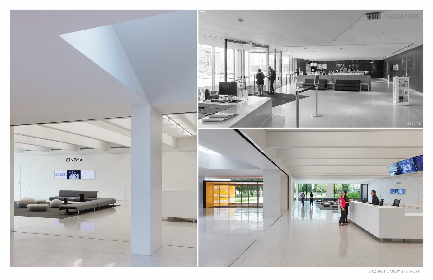 Visitors enter through a bronze vestibule, lined in a high-gloss Ferrari-yellow aluminum liner, offering contrast to the pure white interiors of the original Barnes building. The entry from the underground parking has been vastly improved, where a formerly circuitous path through a cramped hallway is straightened out and expanded, offering a direct visual connection from the parking lot to the sculpture garden. The pavilion contains a new restaurant featuring an expansive canvas for rotating art, and floor to ceiling windows that overlook Claes Oldenburg’s iconic Spoonbridge and Cherry sculpture. The renovated lobby is opened up to views of the sculpture garden and Barnes’ original precast concrete tees, covered by a lid in the 2005 renovation, are exposed and celebrated. A new centrally-located information desk, satellite museum shop and lounge area transform the space into a new public hub connecting the primary visitor amenities.
