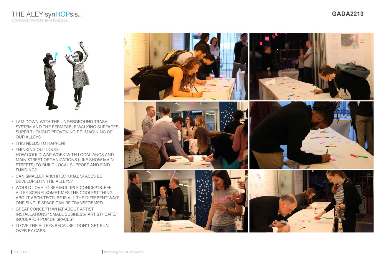 Through engaging with the community and making the leap into physical space, we are creating a platform for discussion and community feedback to collectively consider the future of DC’s unique spaces. The conversations shared at the Alley Hop! over food, drink, and shared interest will become the springboard for future interventions and will synthesize the needs and desires of the both the city’s administration, its future infrastructure, and its existing and future inhabitants.