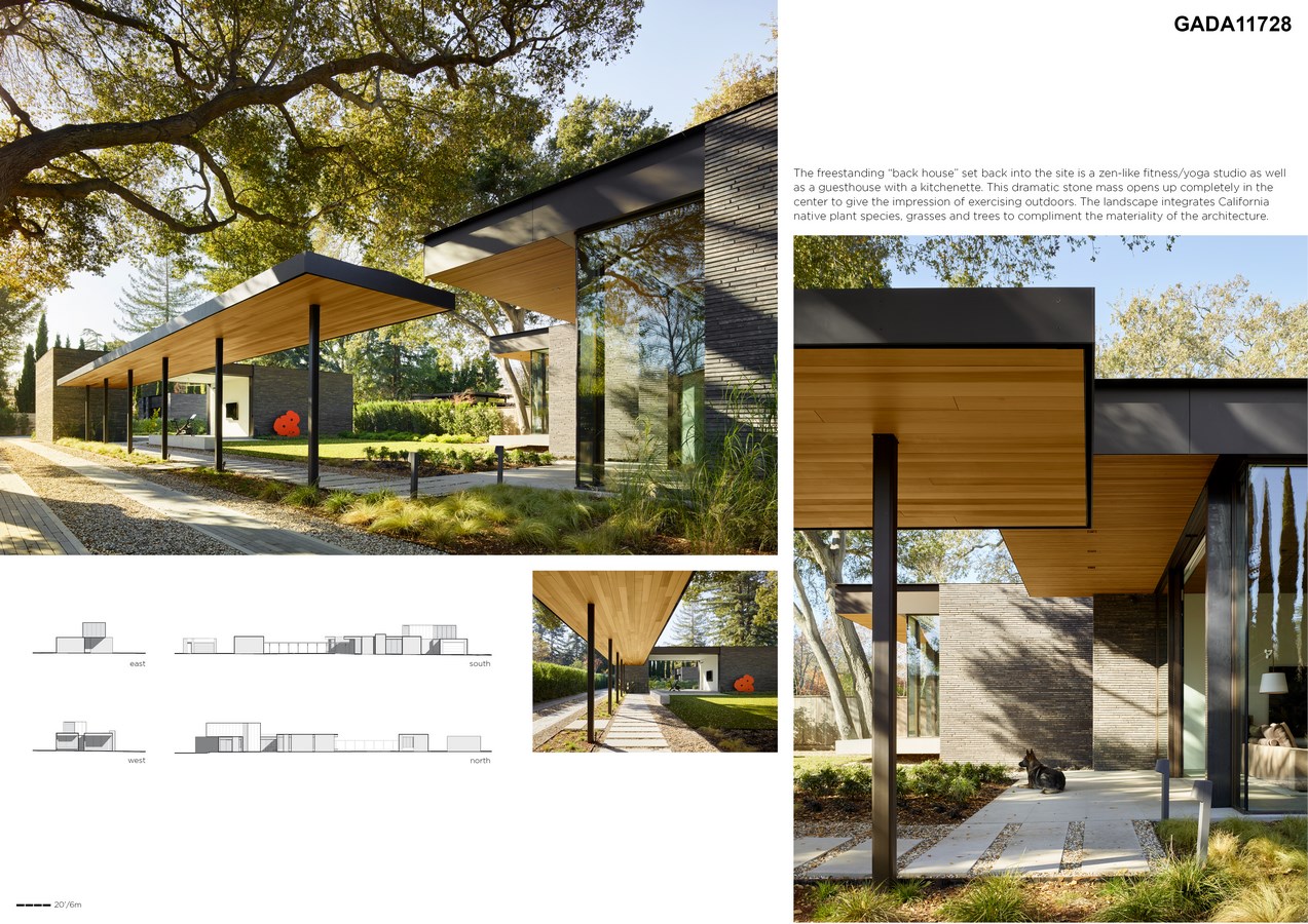 The freestanding “back house” set back into the site is a zen-like fitness/yoga studio as well as a guesthouse with a kitchenette. This dramatic stone mass opens up completely in the center to give the impression of exercising outdoors. The landscape integrates California native plant species, grasses and trees to compliment the materiality of the architecture.