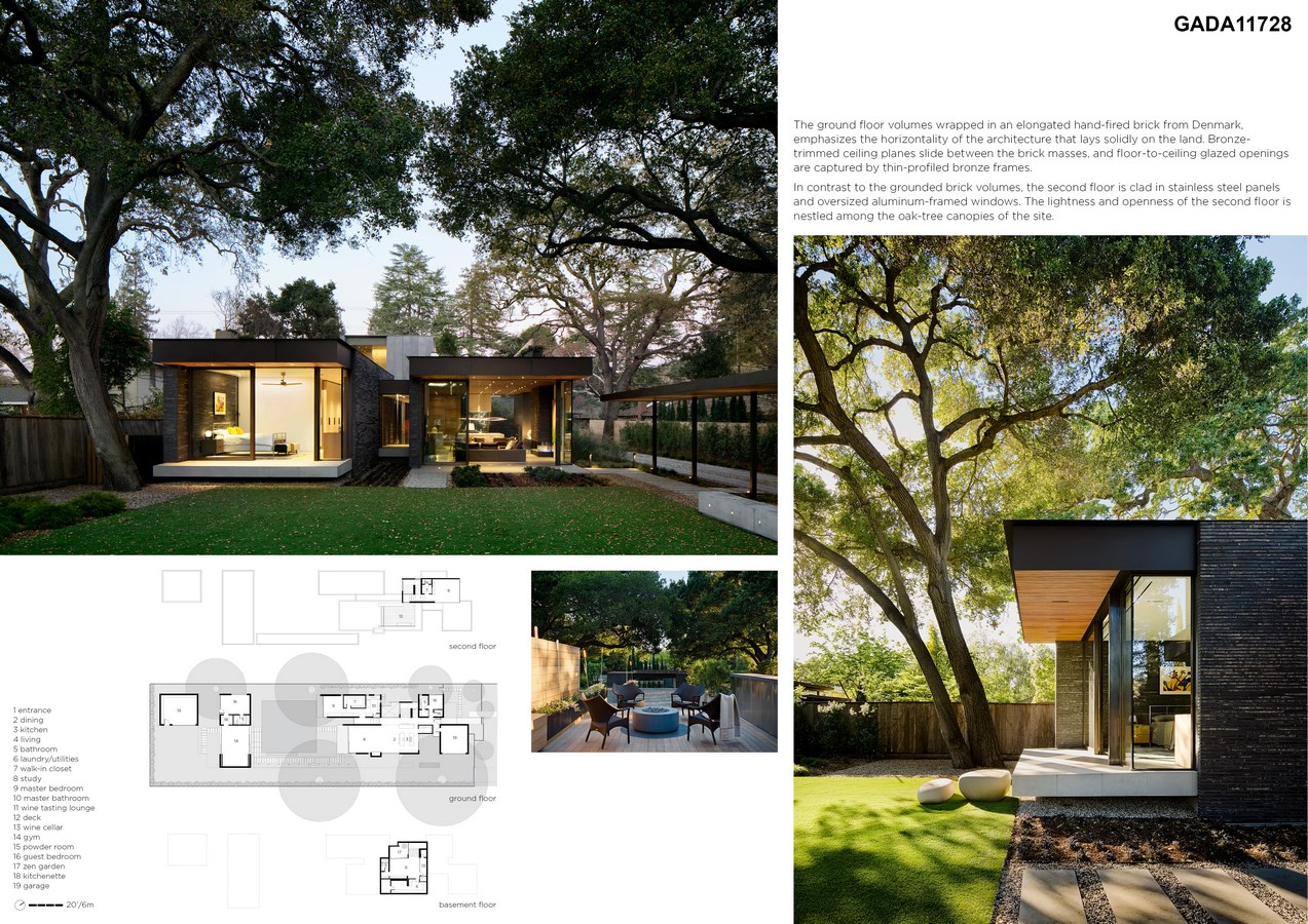 The ground floor volumes wrapped in an elongated hand-fired brick from Denmark, emphasizes the horizontality of the architecture that lays solidly on the land. Bronze-trimmed ceiling planes slide between the brick masses, and floor-to-ceiling glazed openings are captured by thin-profiled bronze frames.