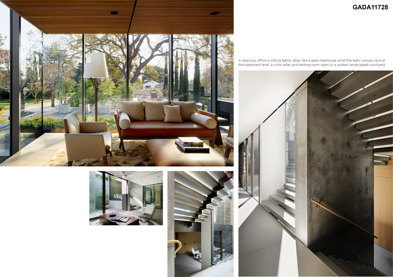 At the basement level, a wine cellar and tasting room open to a sunken landscaped courtyard.