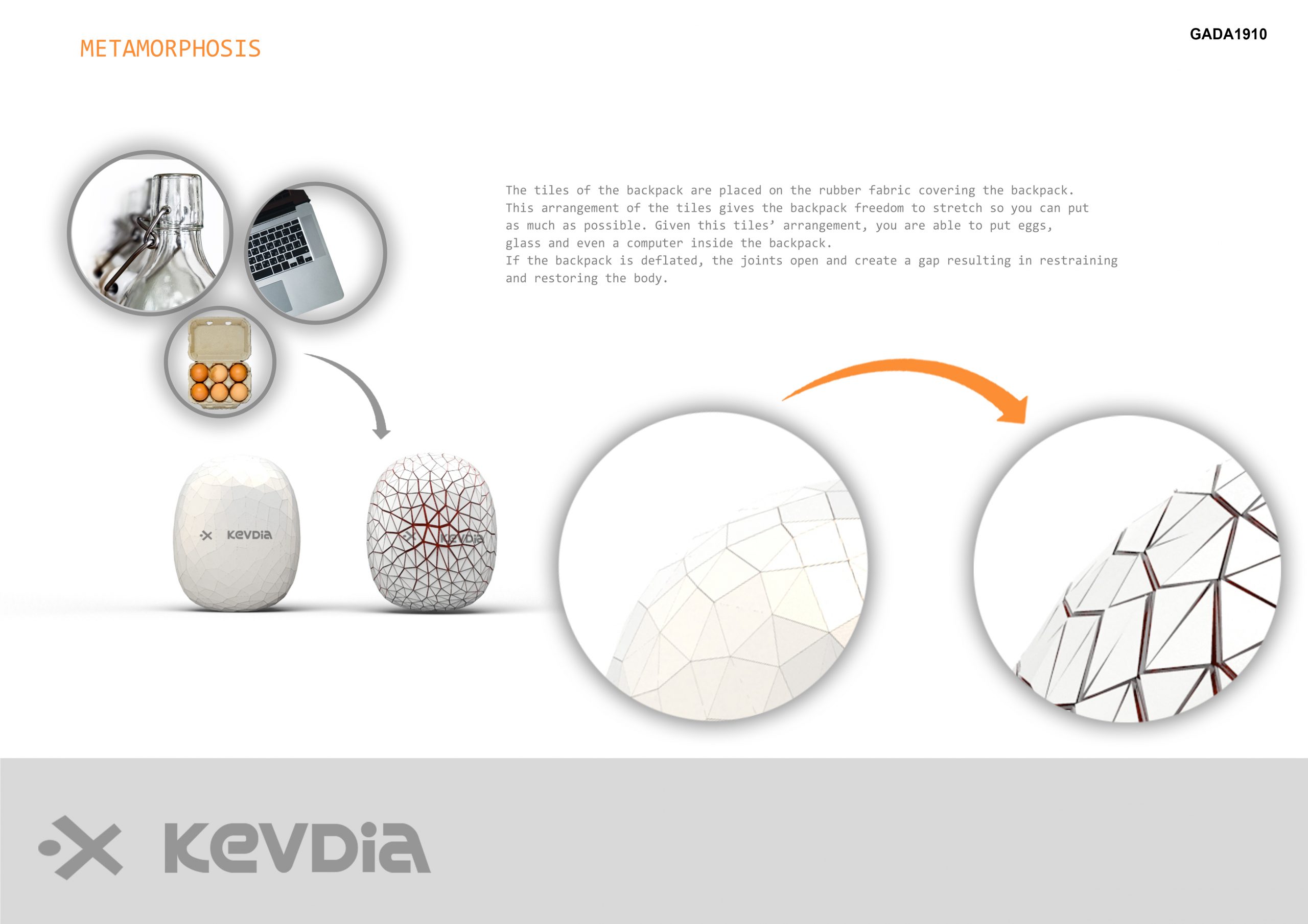Given this tiles’ arrangement, you are able to put eggs, glass and even a computer inside the backpack. If the backpack is deflated, the joints open and create a gap resulting in restraining and restoring the body.