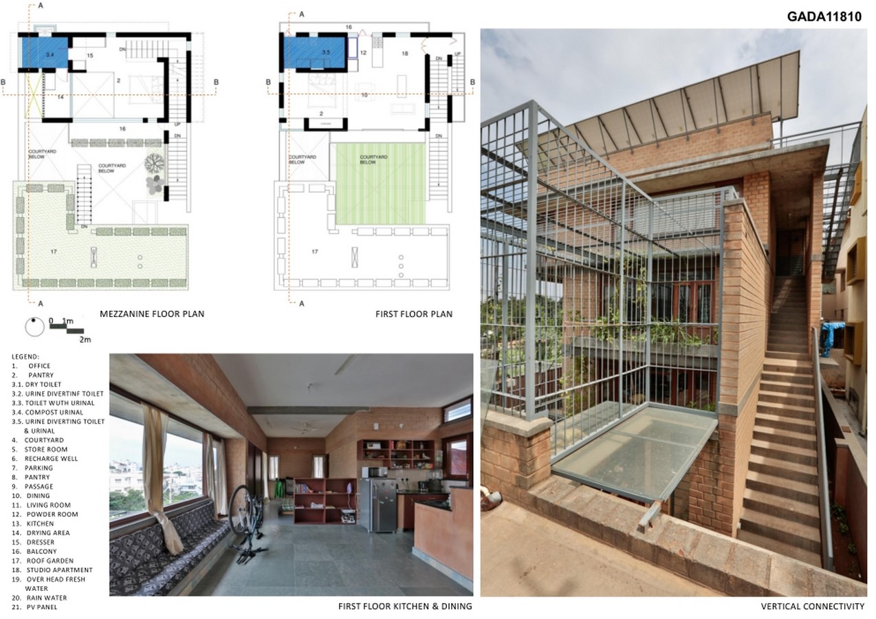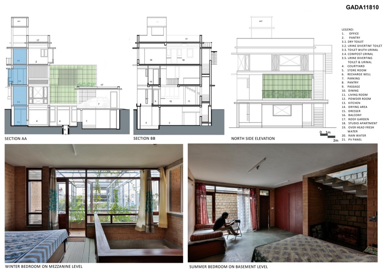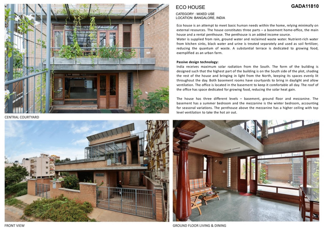 Eco house is an attempt to meet basic human needs within the home, relying minimally on external resources. The house constitutes three parts – a basement home-office, the main house and a rental penthouse. The penthouse is an added income source. Water is supplied from rain, ground water and reclaimed waste water. Nutrient-rich water from kitchen sinks, black water and urine is treated separately and used as soil fertilizer, reducing the quantum of waste. A substantial terrace is dedicated to growing food, exemplified as an urban farm.