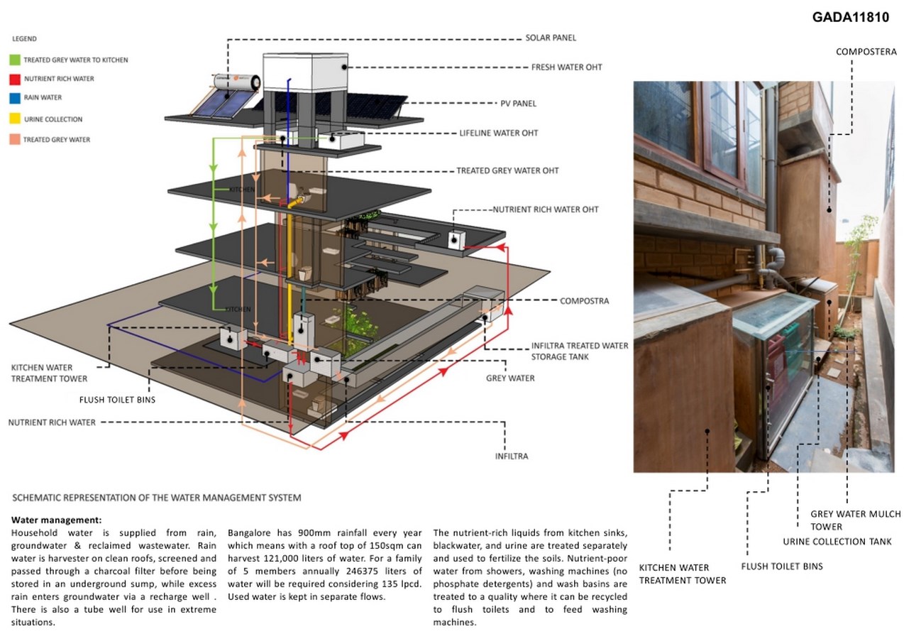 Household water is supplied from rain, groundwater & reclaimed wastewater. Rain water is harvester on clean roofs, screened and passed through a charcoal filter before being stored in an underground sump, while excess rain enters groundwater via a recharge well. There is also a tube well for use in extreme situations. Bangalore has 900mm rainfall every year which means with a roof top of 150sqm can harvest 121,000 liters of water. For a family of 5 members annually 246375 liters of water will be required considering 135 lpcd. Used water is kept in separate flows. The nutrient-rich liquids from kitchen sinks, blackwater, and urine are treated separately and used to fertilize the soils. Nutrient-poor water from showers, washing machines (no phosphate detergents) and wash basins are treated to a quality where it can be recycled to flush toilets and to feed washing machines.