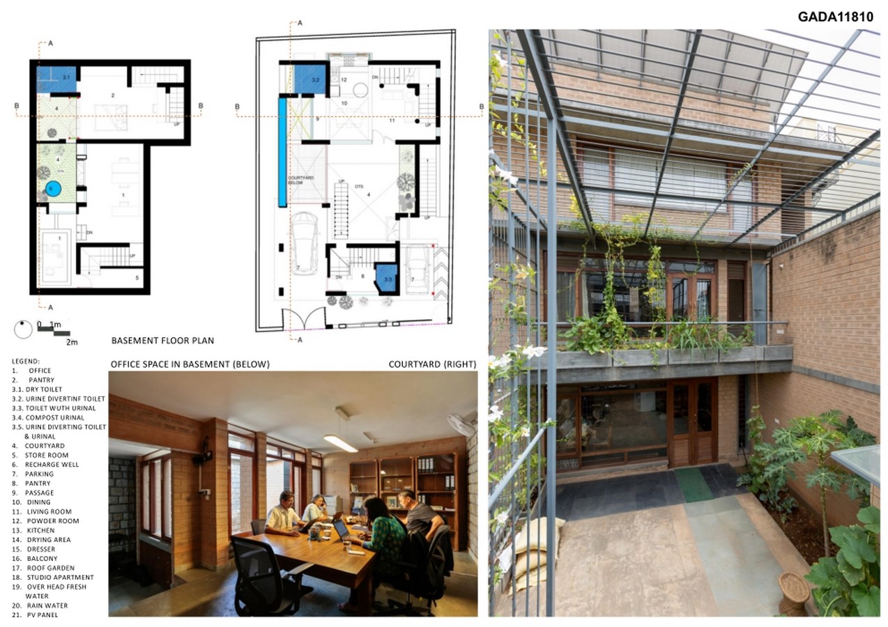 India receives maximum solar radiation from the South. The form of the building is designed such that the highest part of the building is on the South side of the plot, shading the rest of the house and bringing in light from the North, keeping its spaces evenly lit throughout the day. Both basement rooms have courtyards to bring in daylight and allow ventilation. The office is located in the basement to keep it comfortable all day. The roof of the office has space dedicated for growing food, reducing the solar heat gain.