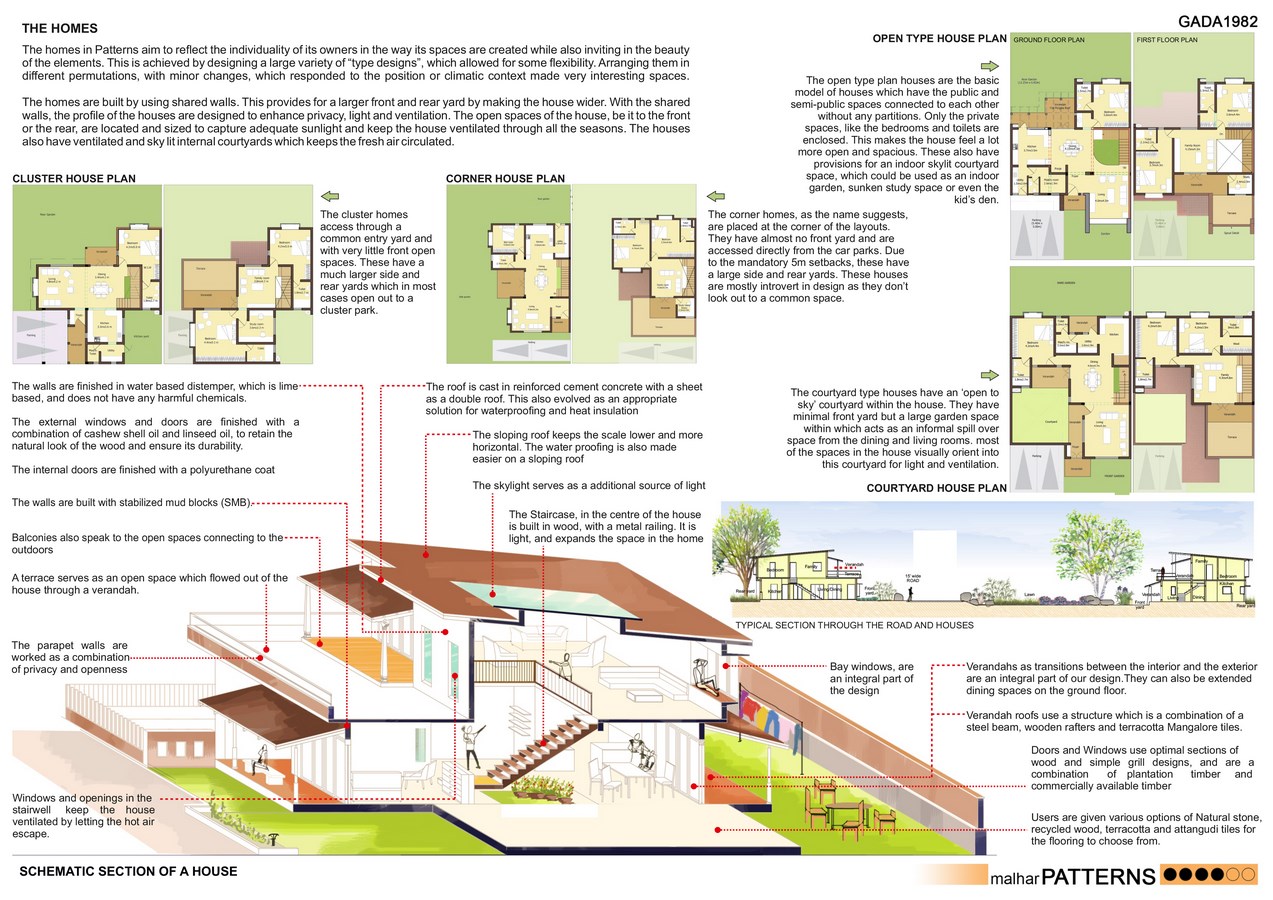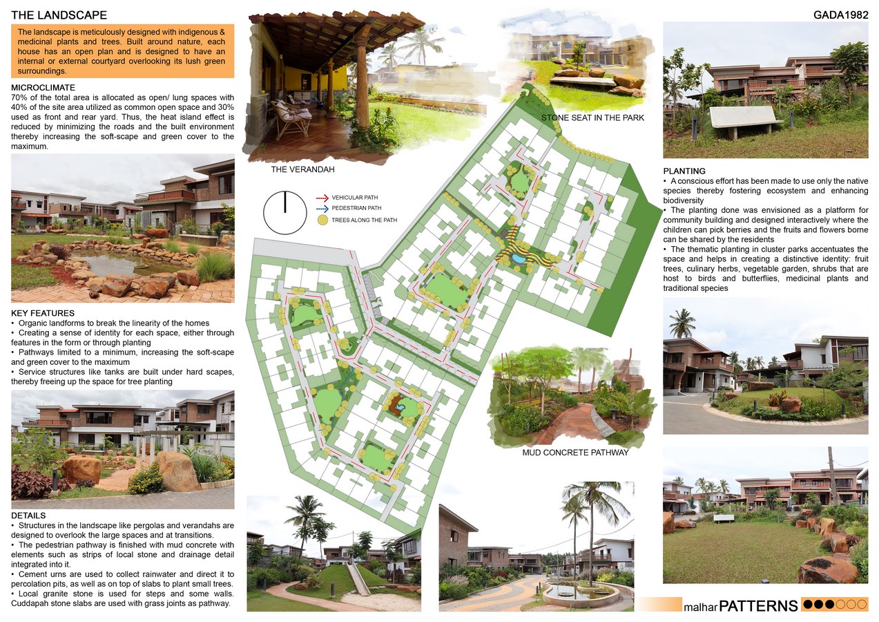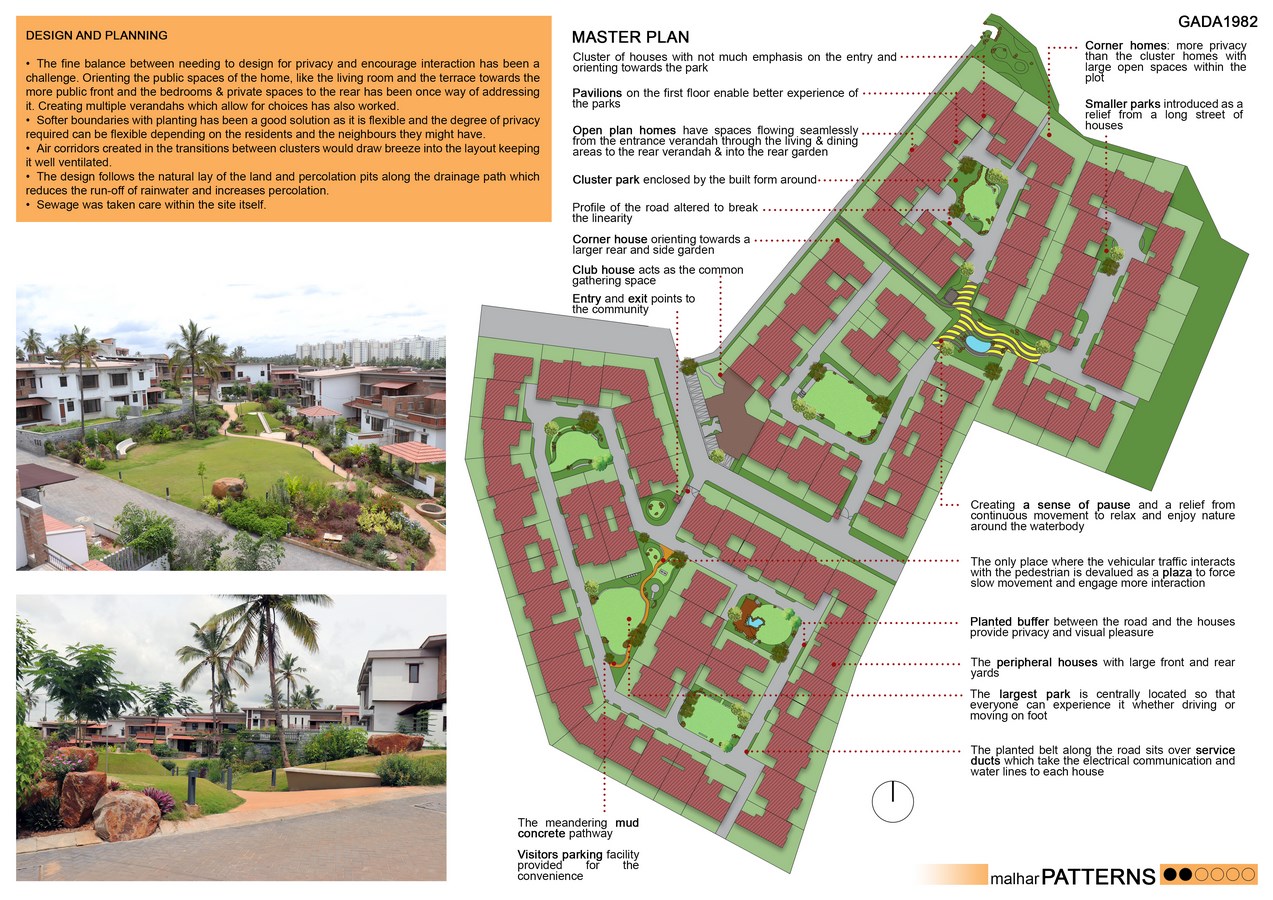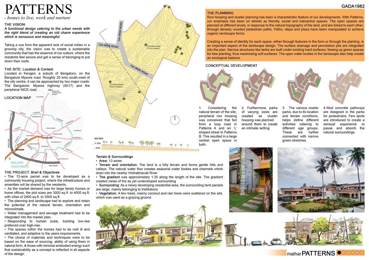 Set amidst thirteen acres of expansive gently sloping land, Patterns is a mix typology of row housing and clusters amalgamated organically according to the natural terrain of the site. Divided into two sections on either side of the 12-metre-wide road, Patterns-A is a cluster of 45 homes arranged around a loop and Patterns-B is a group of 47 houses arranged amidst three cluster parks along an L shaped street.