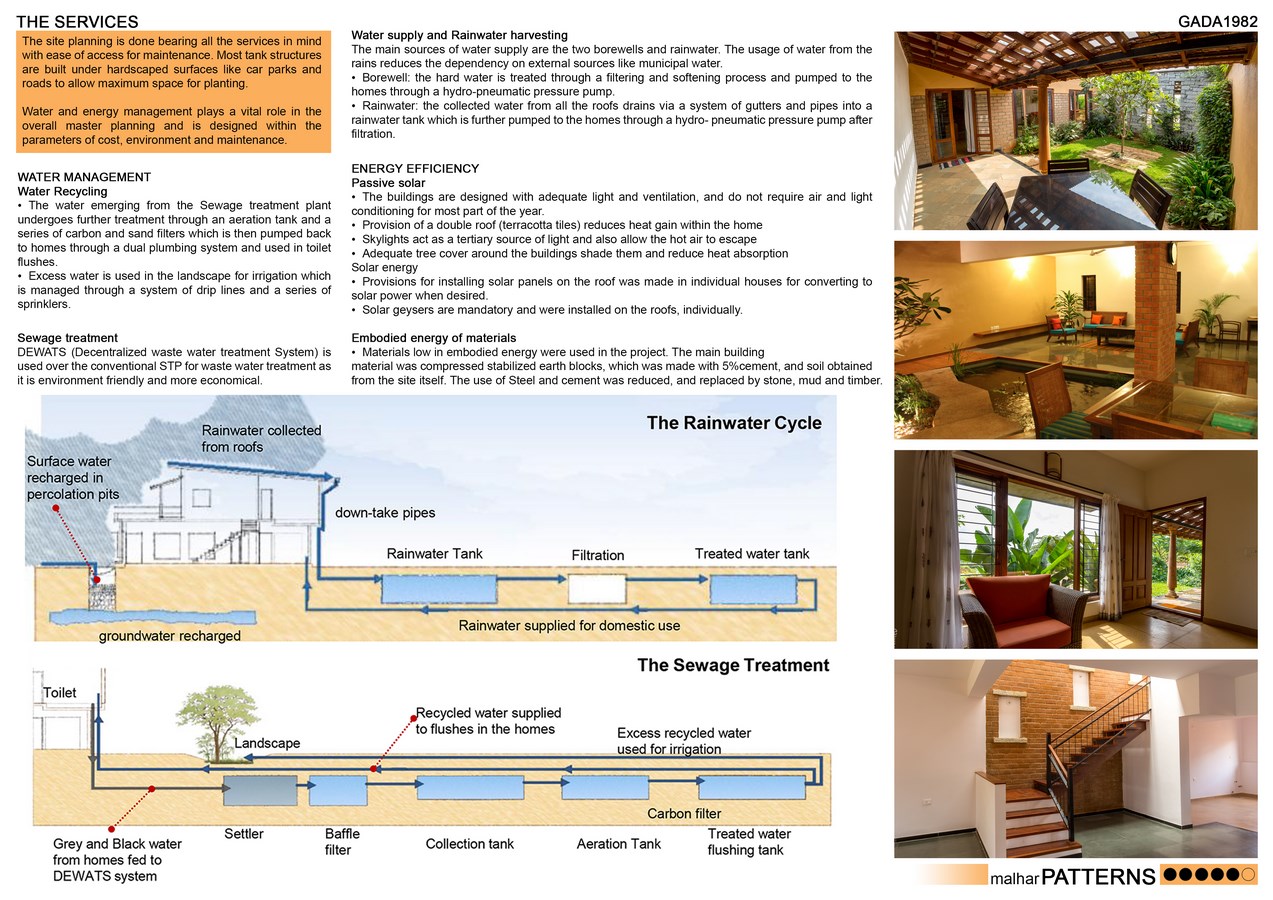 Various sustainable techniques have been implemented such as the usage of DEWATS (Decentralized wastewater treatment System) over the conventional STP for wastewater treatment; water recycling is encouraged by using the treated water for toilet flushes and irrigation for landscape; and an efficient network is designed for rainwater harvesting such that the community can self-sustain without depending on the municipality.