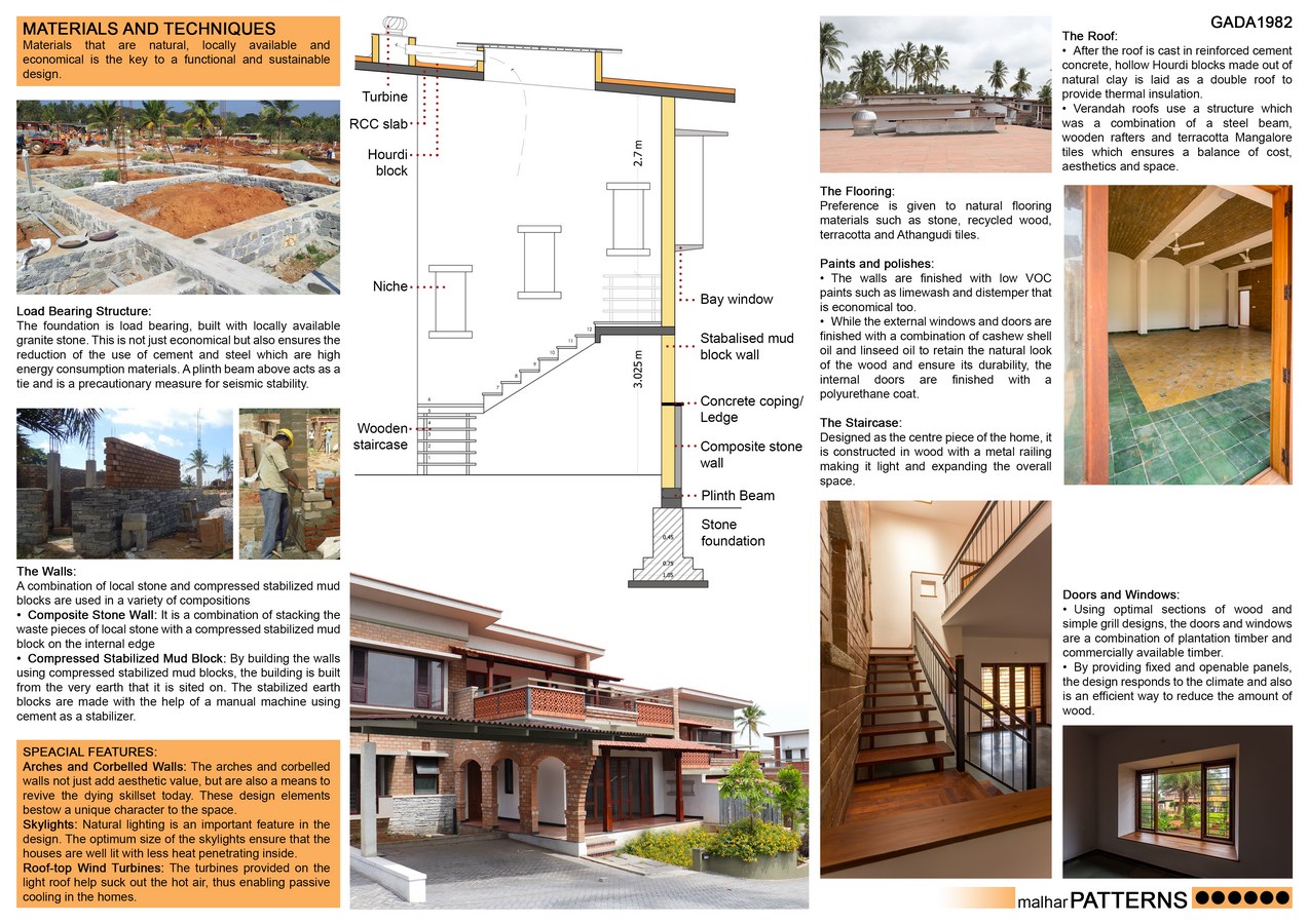 The residences designed are climate responsive with adequate light and ventilation. Use of sustainable materials such as walls made out of compressed stabilized earth blocks, Hourdi blocks for roofing, skylights and roof turbines ensure optimum temperature throughout the year. Preference is given to natural flooring materials: stone, recycled wood, terracotta and Athangudi tiles, and low VOC paints are used which are economical and enhance the aesthetics. Unique design elements such as arches, corbelled walls, wooden pillars and bay windows add a touch of rustic appeal in the overall design.