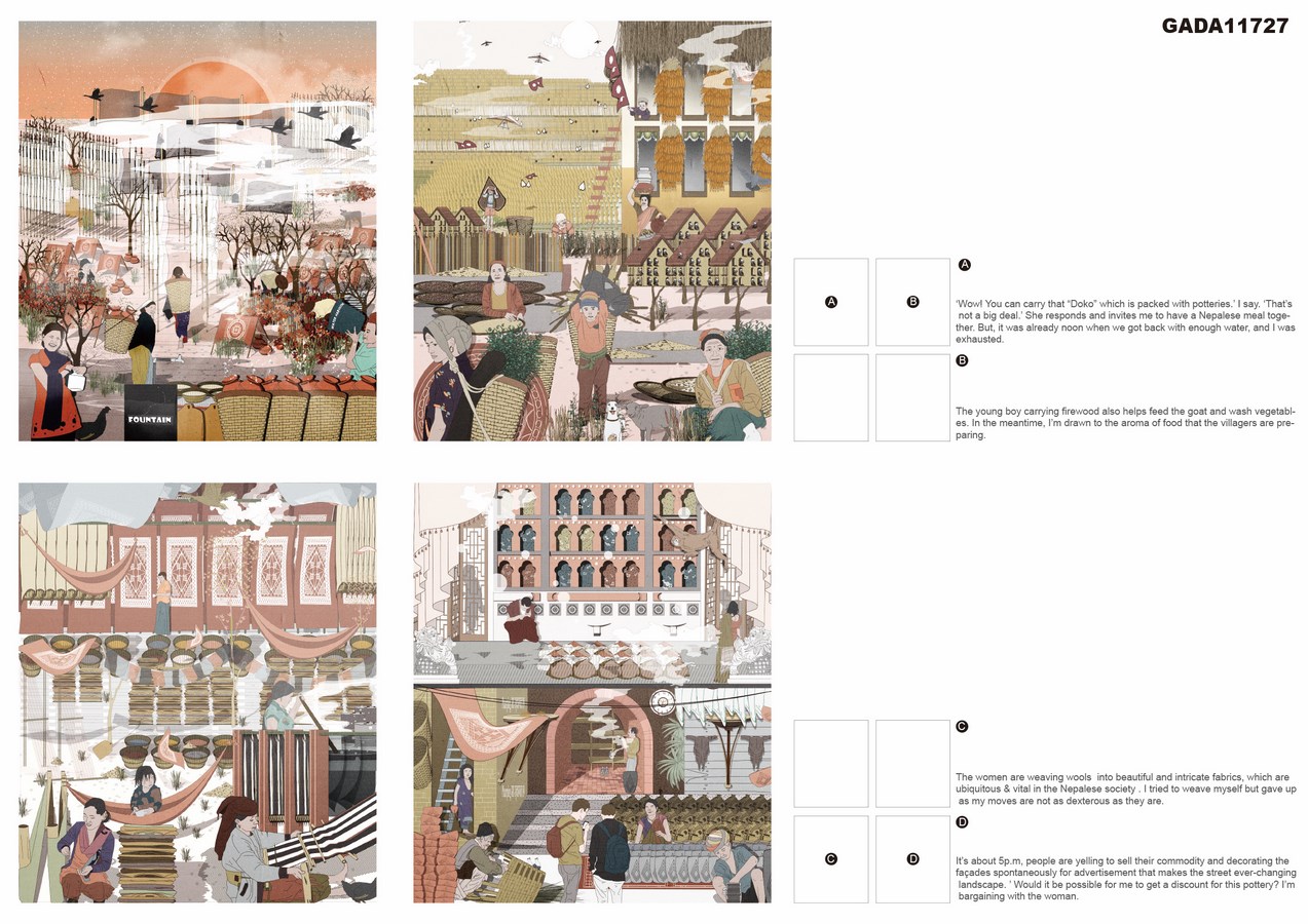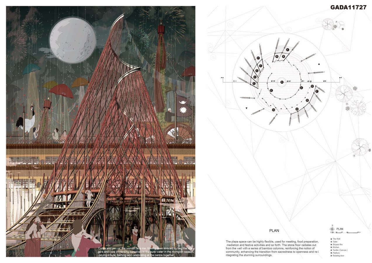 Situated in the absolutely picturesque landscape, the site is also enriched by the diversity of cultures and religions, endowed with supremely natural power. However, the topography, the growing population, and the lack of infrastructure result in water scarcity that needs to be addressed through architectural intervention. Water has been seen as a sacred component in Nepal in terms of religious activities and everyday life. Thus, the proposal focuses on transforming conventional community centre into “pilgrimage of everyday life”. The centre draws on locally sourced, sustainable materials but seeks to use them in innovative ways, thereby allowing the villagers to preserve their traditions and harvesting water with a sense of proud and dignity. Taking inspiration of Nepalese daily outfit, Doko, the bamboo structures are interwoven with meshes to a religiously and locally significant typology, representing and encouraging the villagers to be engaged with the construction of this iconic centre- one they can appreciate and take pride in.