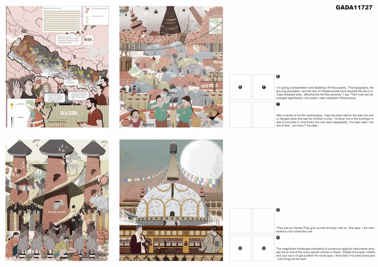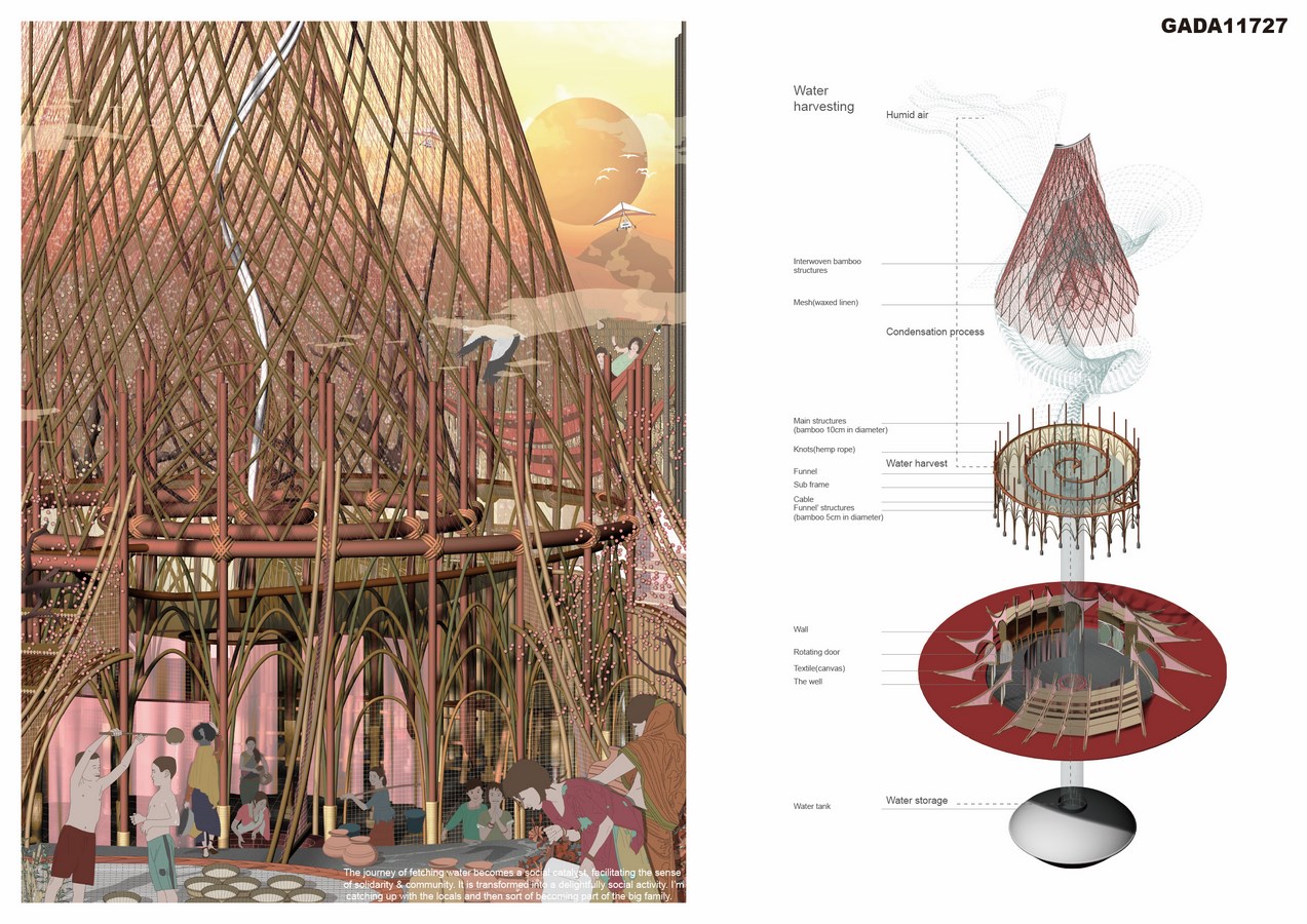The project mainly tackles water-related issues and explores the ideal prototype of an egalitarian community centre which serves for all people. By introducing the fog catcher technique, it proposes to create a multifunctional gathering place for casual interaction, knowledge sharing, rites and so on.