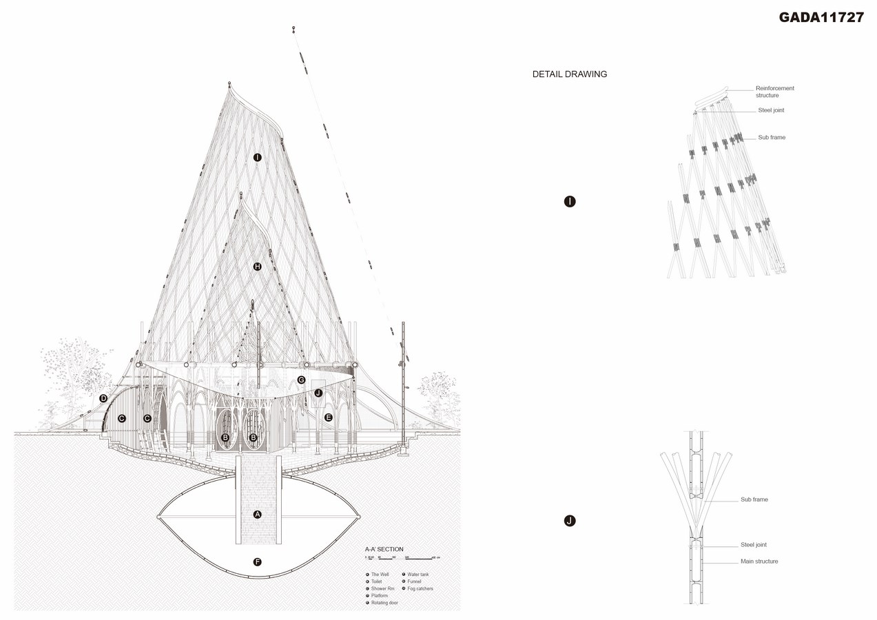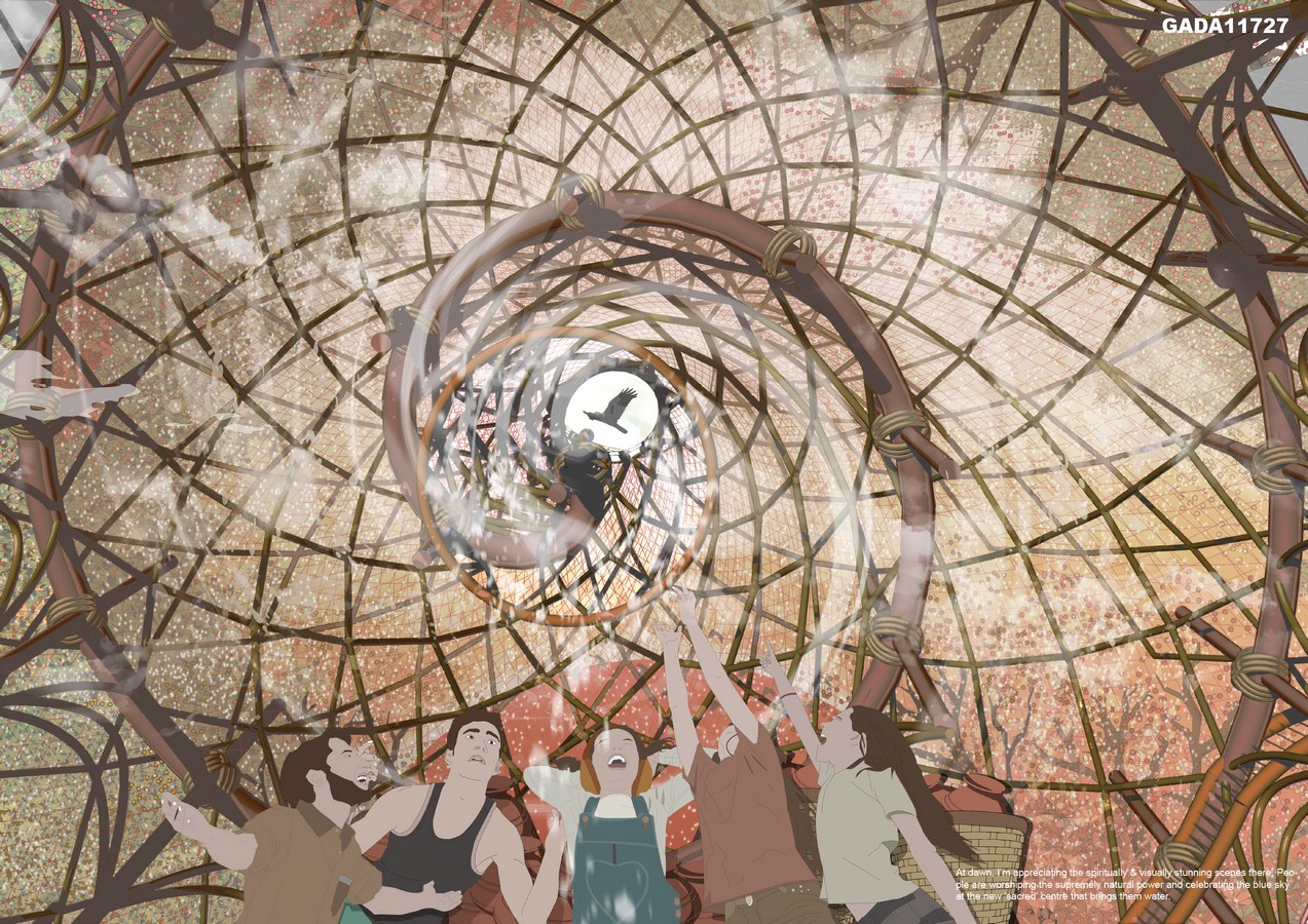 Formed from waxed linen held in bamboo structures above ground floor, the fog catchers allow humid air to pass through then condense it into droplets which are transported down the funnel and then the well. Furthermore, the system is capable of generating over 1300 litres of water per day, tremendously ameliorating the inefficiency of water collection, as well as creating ever-changing landscape formed by the glistening, translucent waxed linen. Also, the spiral structure amplifies the abundance of religious and natural power in this area, providing a place beneath it for people to worship the blue sky and celebrate the harvest of water.