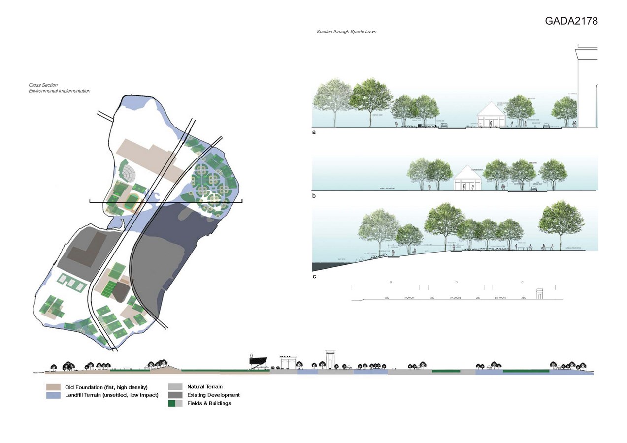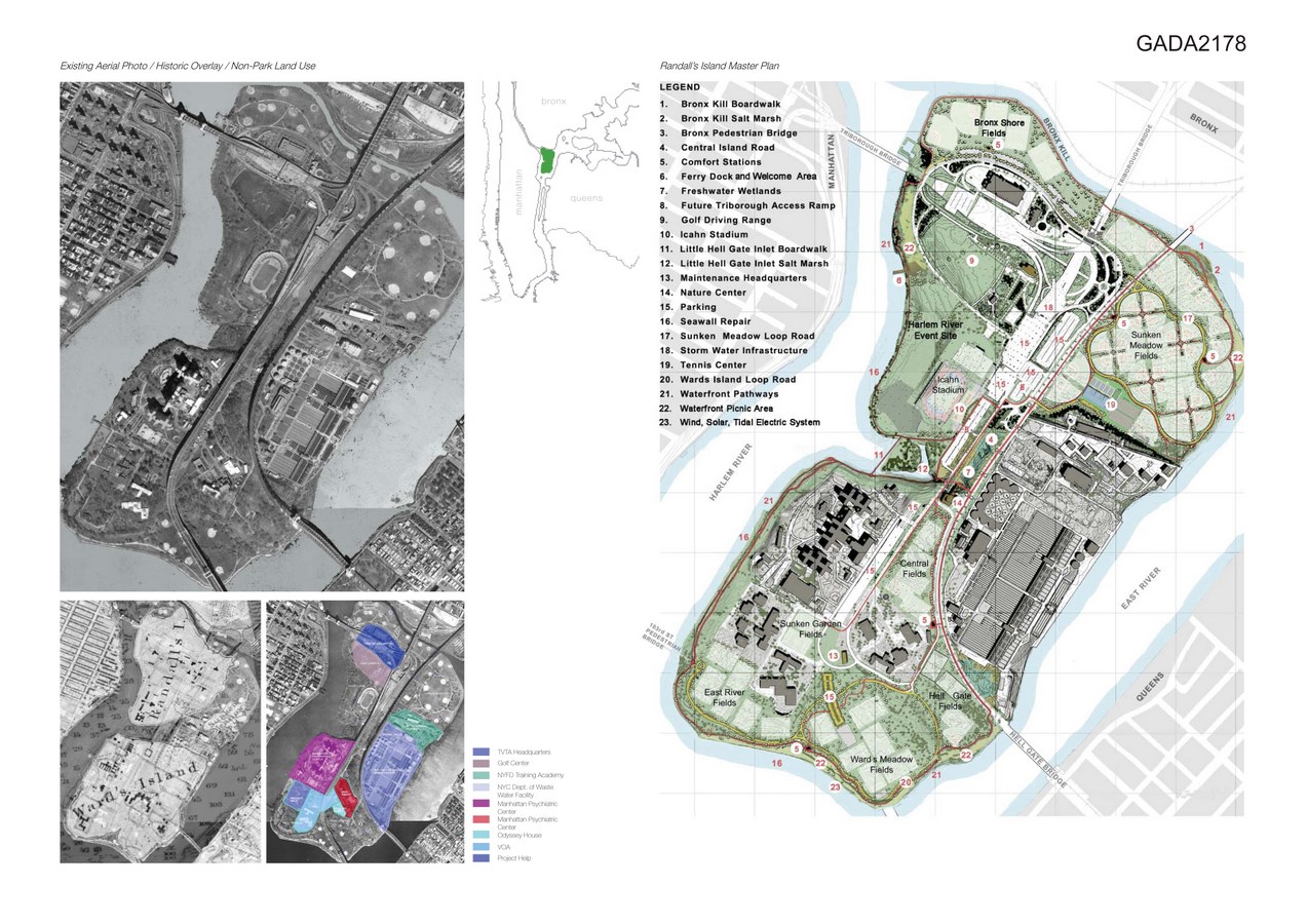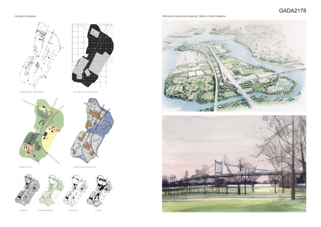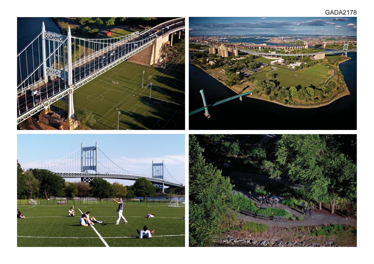 The design originates from a superimposition of macro-systems that blur the distinction between artificial elements such as the playing fields and buildings, with the natural landscape. A north-south organizing grid derived from Manhattan’s grid is superimposed on the island to provide a reference for gauging distances, and to allow for the organization and orientation of regulation sports fields. The interstices of the grid locate park buildings or amenities. When possible, buildings are placed away from the bridges allowing views from the central circulation spine to the surrounding rivers. Major buildings are located against non-park buildings to create an edge between the fields and non-park buildings which serve as a backdrop to the new fields. Major vehicular circulation occurs via a central north-south road with large parking areas organized along its length with narrow, meandering roads accessing areas of playing fields. A perimeter bicycle and pedestrian path also circulates around the edge of the island.
