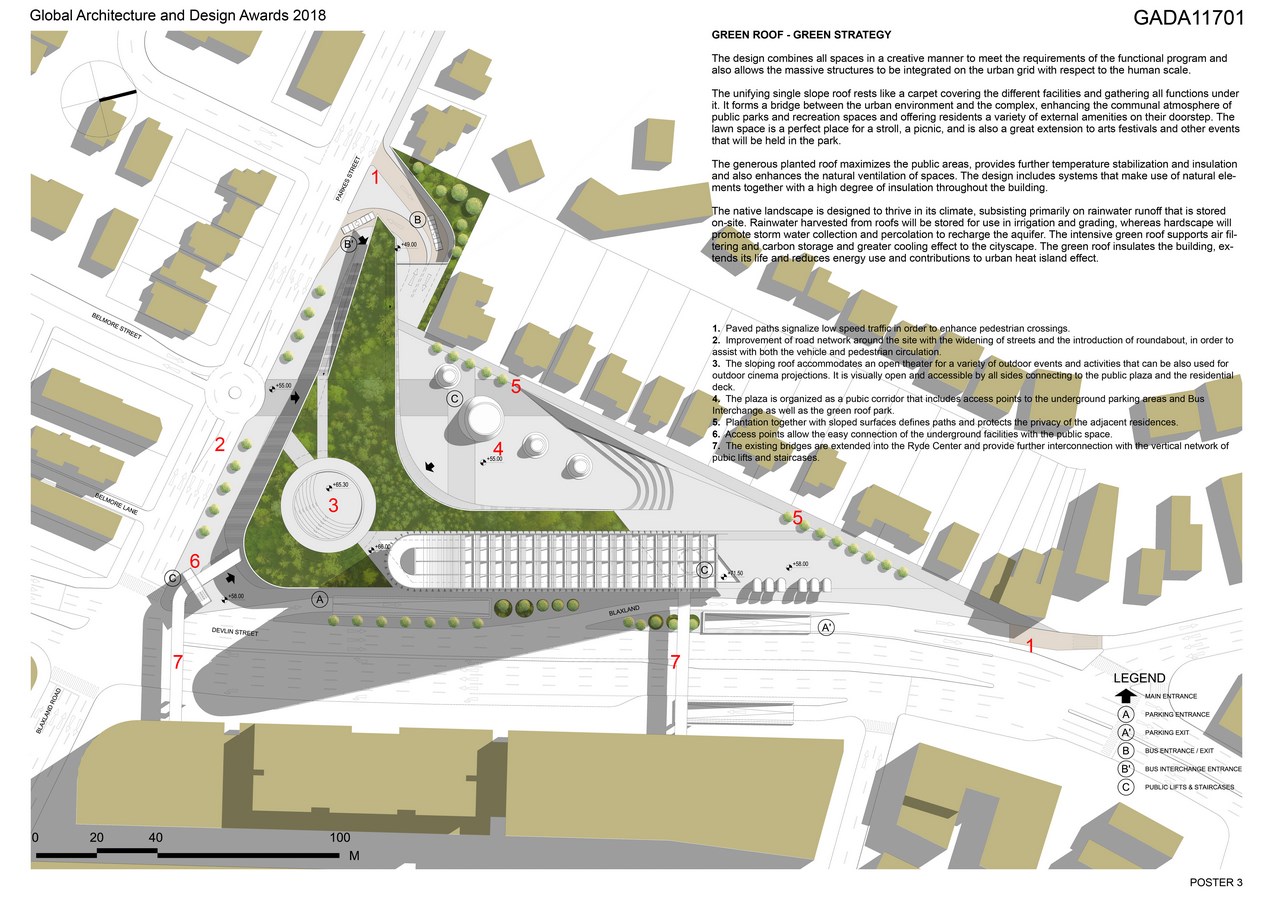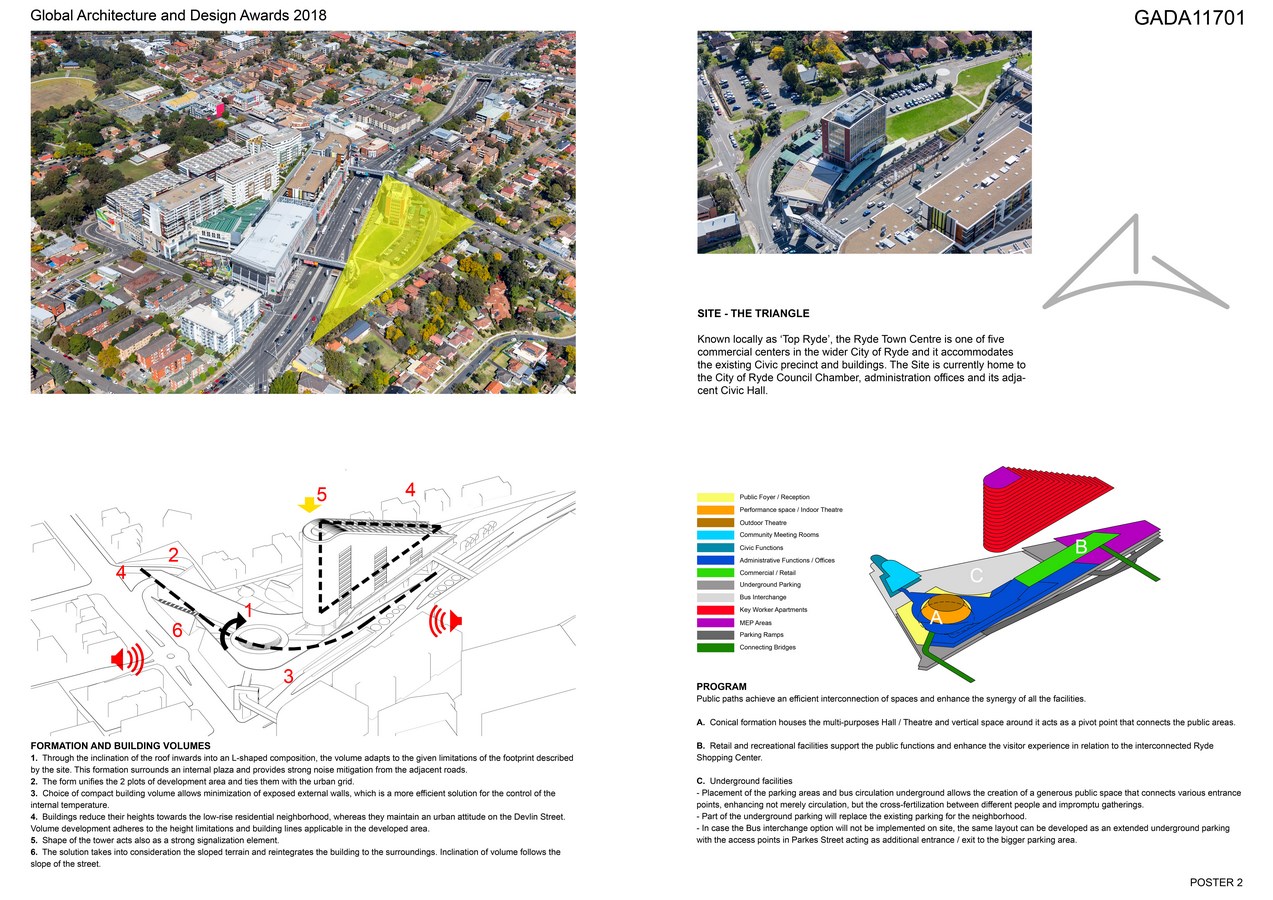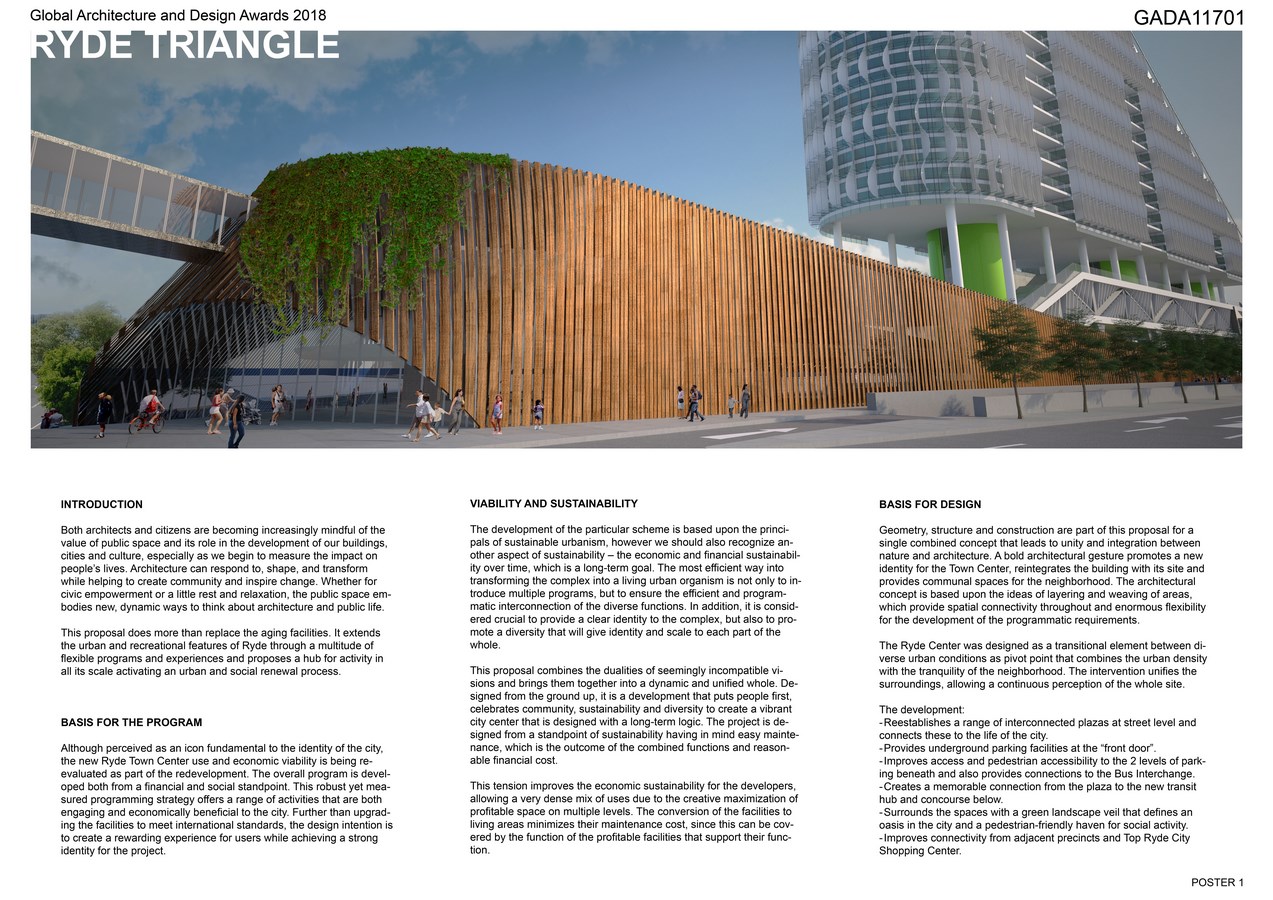This proposal does more than replace the aging facilities of existing Ryde Town Center. It extends the urban and recreational features of Ryde through a multitude of flexible programs and experiences and proposes a hub for activity in all its scale activating an urban and social renewal process. The Ryde Center was designed as a transitional element between diverse urban conditions as pivot point that combines the urban density with the tranquility of the neighborhood. The intervention unifies the surroundings, allowing a continuous perception of the whole site.