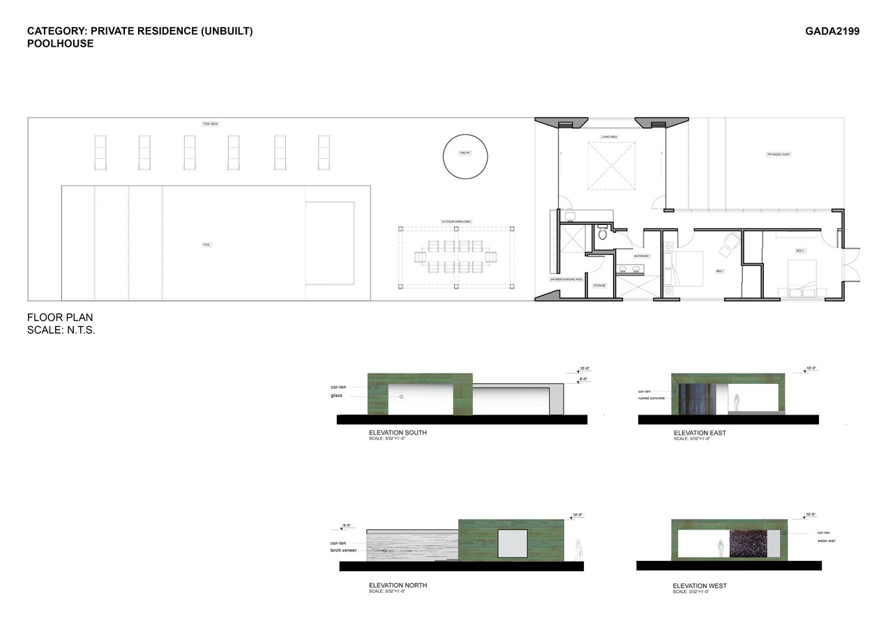 This project, a 1,240 square foot insertion of a pool and pool house onto a wooded site on Long Island in New York, seeks to harmonize the built landscape with the natural landscape. The design responds to the client’s need for guest space and an outdoor recreation area and takes as its narrative the integration of the elements: fire, water and earth, organizing them into a sequential progression on the site.