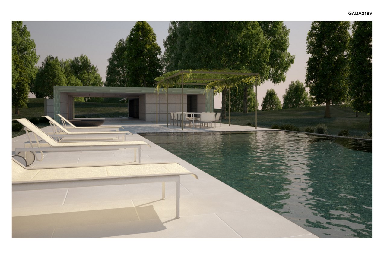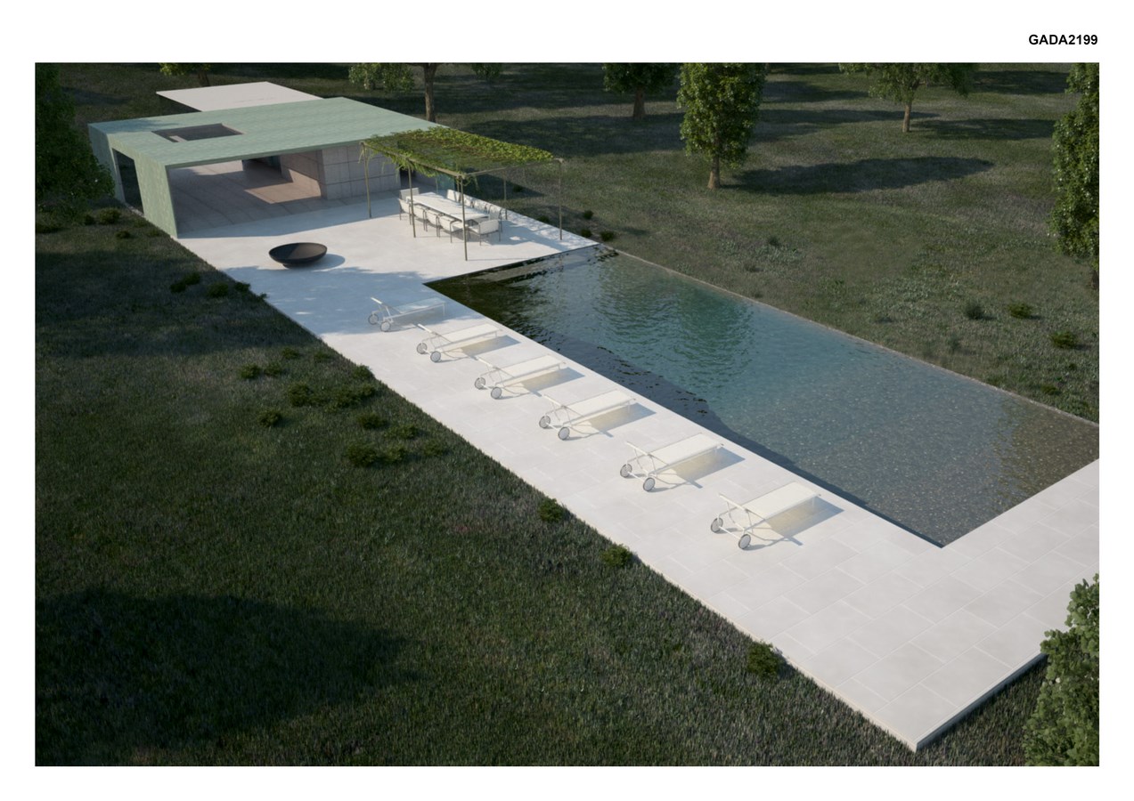 The formal parti consists of three elements: the pool, pool house and accessory building. The pool is designed as a plaza supporting the pool house and frames the landscape. The interlocking volume that houses the bedrooms also defines the bocce court beyond the main space. An oversized fire bowl provides a counterpoint to the simple rectilinear shape of the main room and animates the plaza, creating a focal point around which to gather.