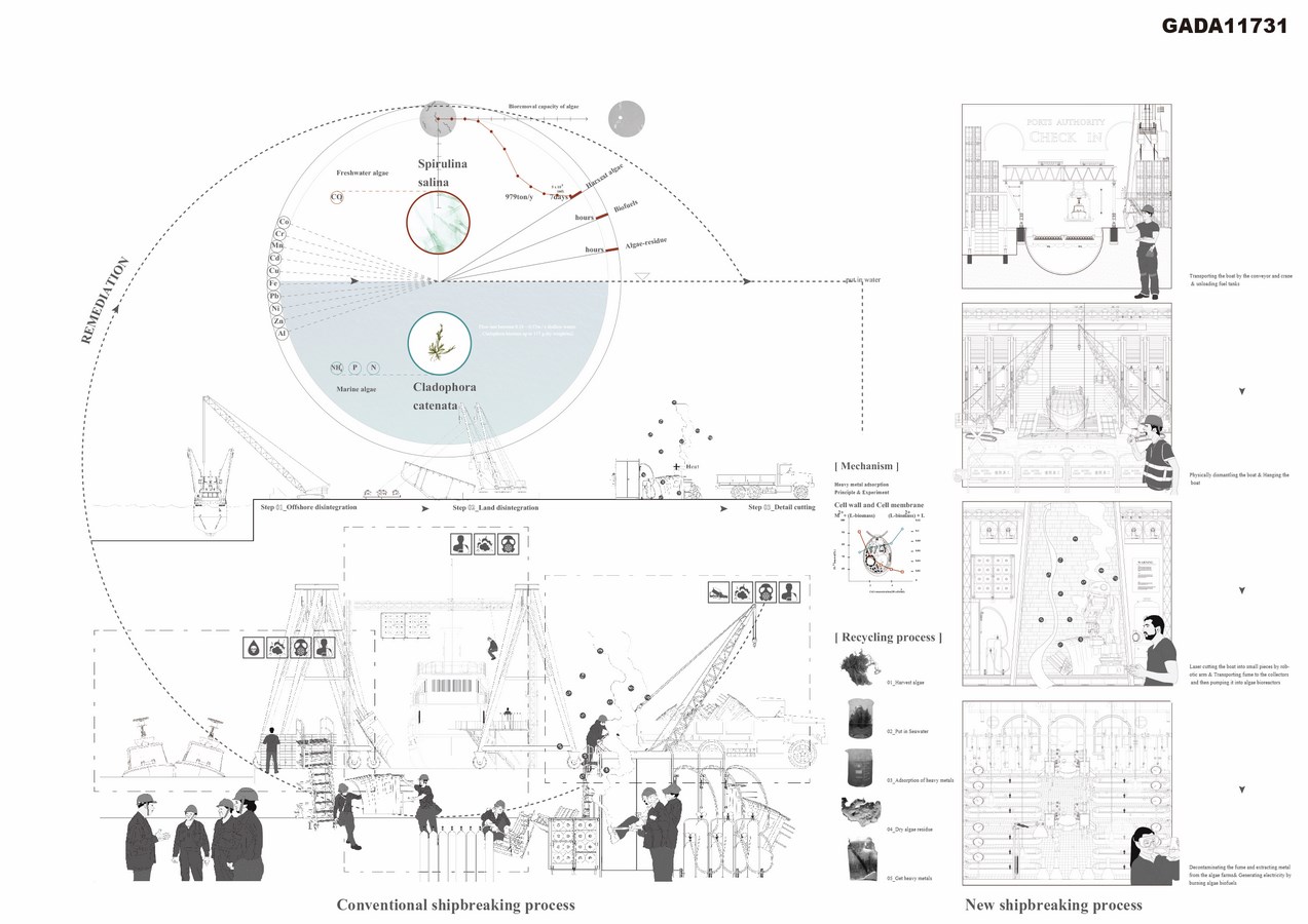 Based on studies and experiments conducted by a local algae lab, spirulina, an endemic species, plays an absolutely vital part in generating electricity and absorbing toxic substances. By utilising digital tools to manipulate the parameters of heat, wind and human activities, the proposal devises ideal spaces for working and algae cultivation including termite cave-like structures that accelerates the contaminated fume produced by the ship-breaking industry being pumped into spirulina-bioreactors. The protein harvested from spirulina is then used for biomass electricity generation which is stored and used as part of the regeneration of the surrounding areas, whereas, the precious metal separated from spirulina can be a new source of decent income for the residents.