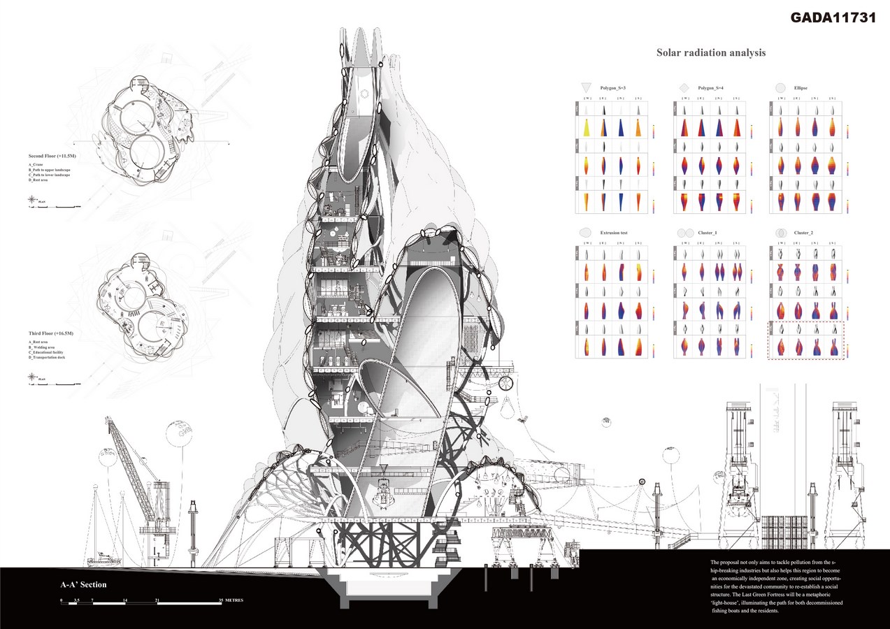 Surrounded by the sea, marine transport has been well-developed in the Hogmaogang village since the 1960s, contributing to various related industries such as ship-breaking industry, which was the main source of income for the residents. Immersing themselves in the ship-breaking yard every day, the residents had a deep attachment to this region before it became an uninhabitable place owing to progressively severe air quality, resulting in various respiratory diseases. The Last Green Fortress researches into applicable mechanics, biomimetic mechanisms and algae technology for a sustainable strategy, removing the stigma of the ship-breaking industry and benefiting the village to flourish anew.