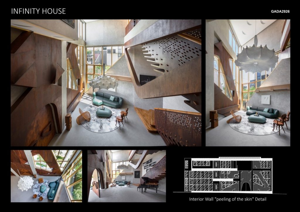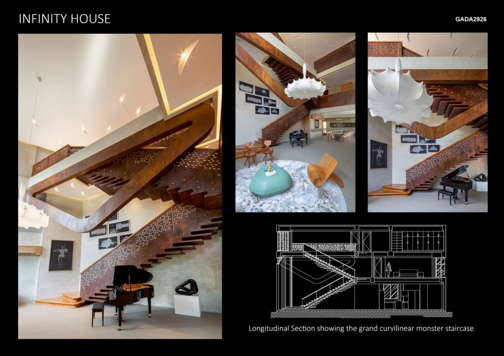 The design of the house is a hybrid of the natural and artificial worlds: nature is represented in the free flowing space and sectional portals like floating in gravity. The artifice is embodied in utilitarian function and intuiting the paradoxical potential in surreal forms: consider the grand curvilinear staircase made of weathered steel with details that resemble eyes – a kind of monster. The same refers to the halfmoon ceiling lights that look like a flock of luminescent birds in flight, again demonstrating a collision of the natural and artificial. One feels the flow of nature as the Infinity House changes character from day to night; by day, it is bathed in texture, a space where people can create and exhilarate in the literal and metaphorical wonders of the house – a space where we are encouraged to contemplate not only the aesthetic quality but also the polemics of the material and immaterial realms.