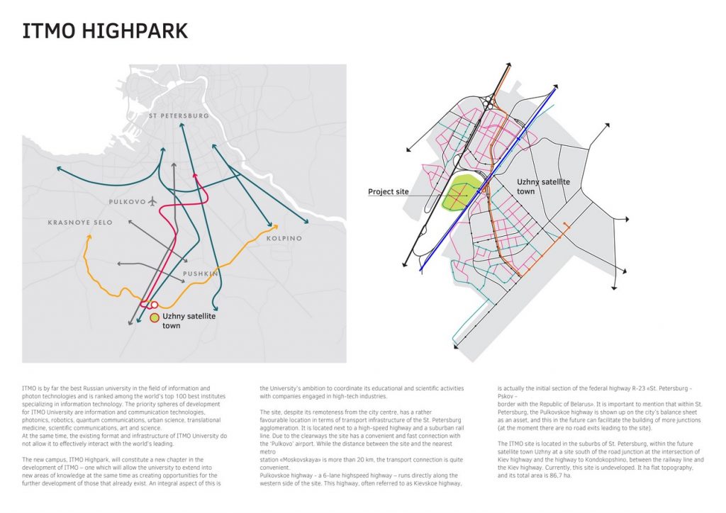 In the next few years, ITMO University plans to build a large new campus, ITMO Highpark, located 17 kilometers south of St. Petersburg. The campus is to become the center of the yet unbuilt satellite city Uzhny and so far the biggest innovation center in St. Petersburg.